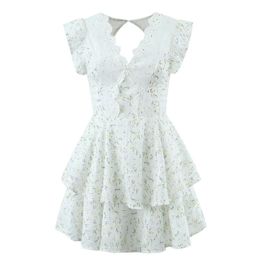 Summer Outfits | Retro French Ruffles Flounced Sleeve Lace Embroidered Tiered Mini Dress
