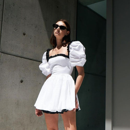 Fashion Outfits 2023 | Black White Contrast Square Collar Puff Sleeve Cut Out Backless Bow Mini Dress