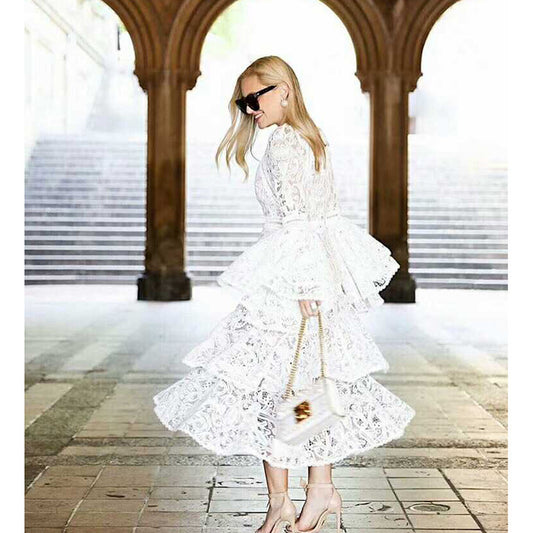 Spring Outfits | White Aesthetic Tiered Lace Ruffles Maxi Dress