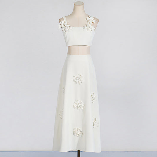 [Fleur Élevée Set] | Sexy 3D Floral Strap Crop Top & High Waist Midi Skirt – Elegant Summer Two-Piece by TGC