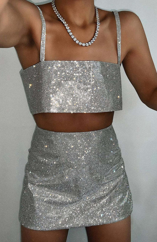 Rhinestone Outfits | Metallic Diamond Rhinestone Glitter Crop Top Skirt Outfit 2-piece Set