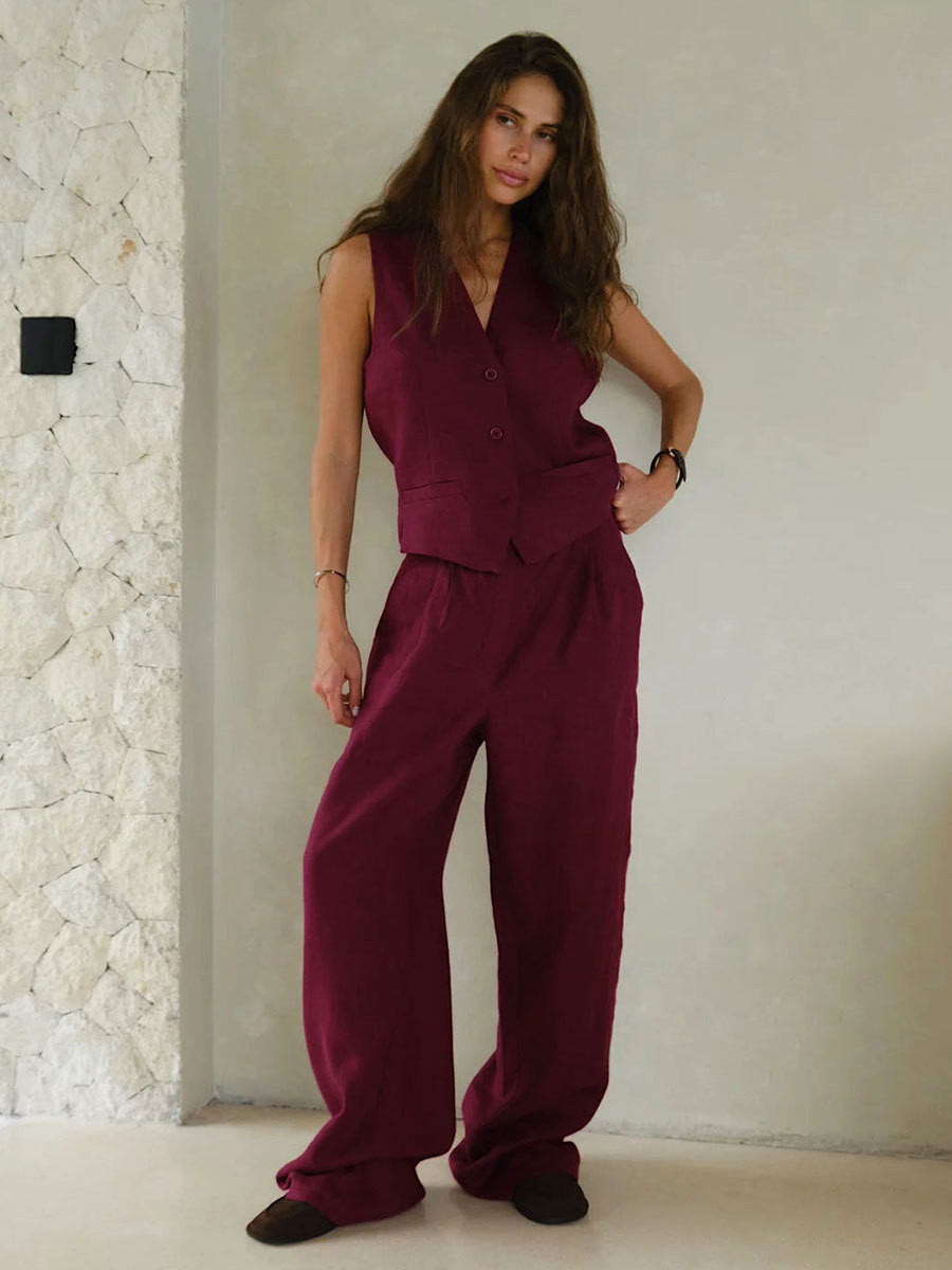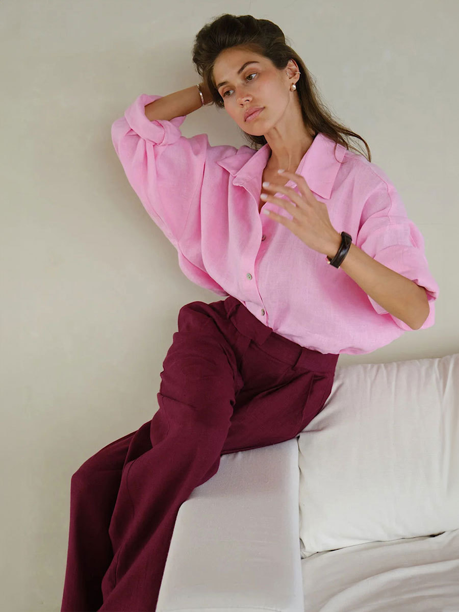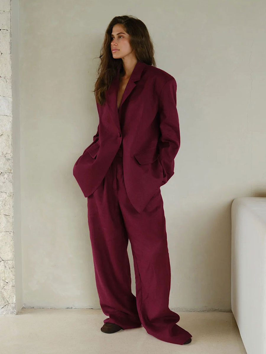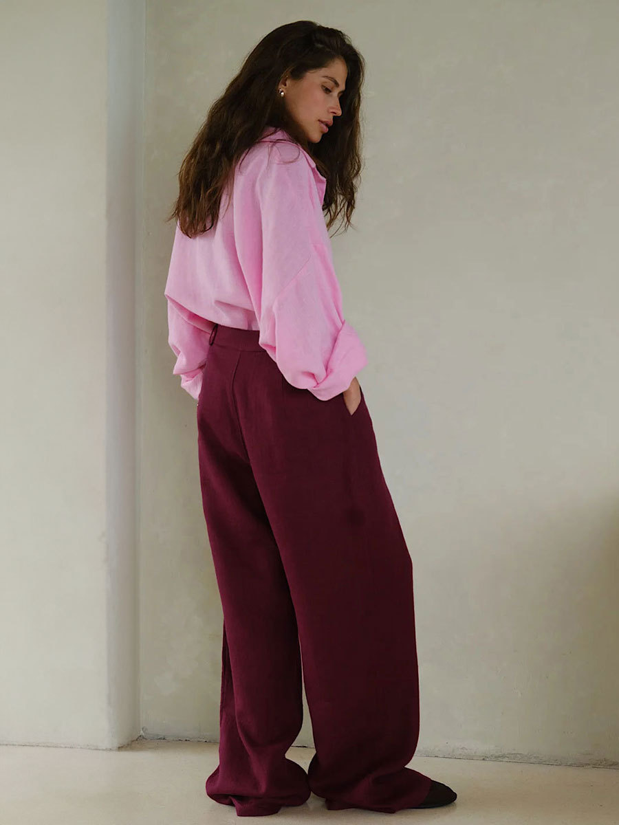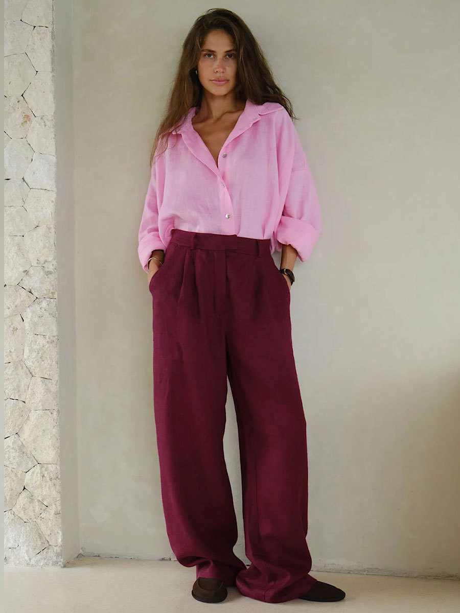 Pair these trousers with a crisp white blouse and loafers for a classic office look or with a lightweight tank and sandals for an effortless weekend outfit. Designed for the modern woman, these Burgundy Cotton Linen Trousers are where comfort meets elegance, making them a must-have staple for your seasonal wardrobe.