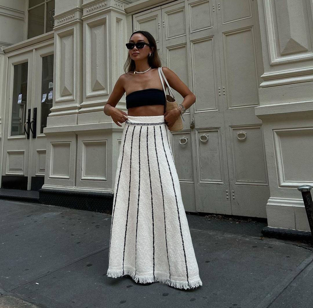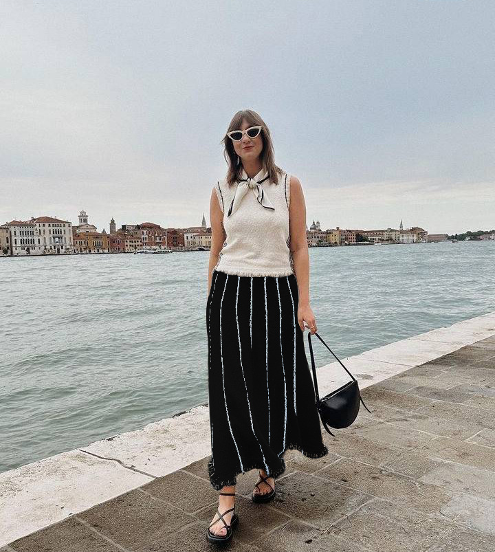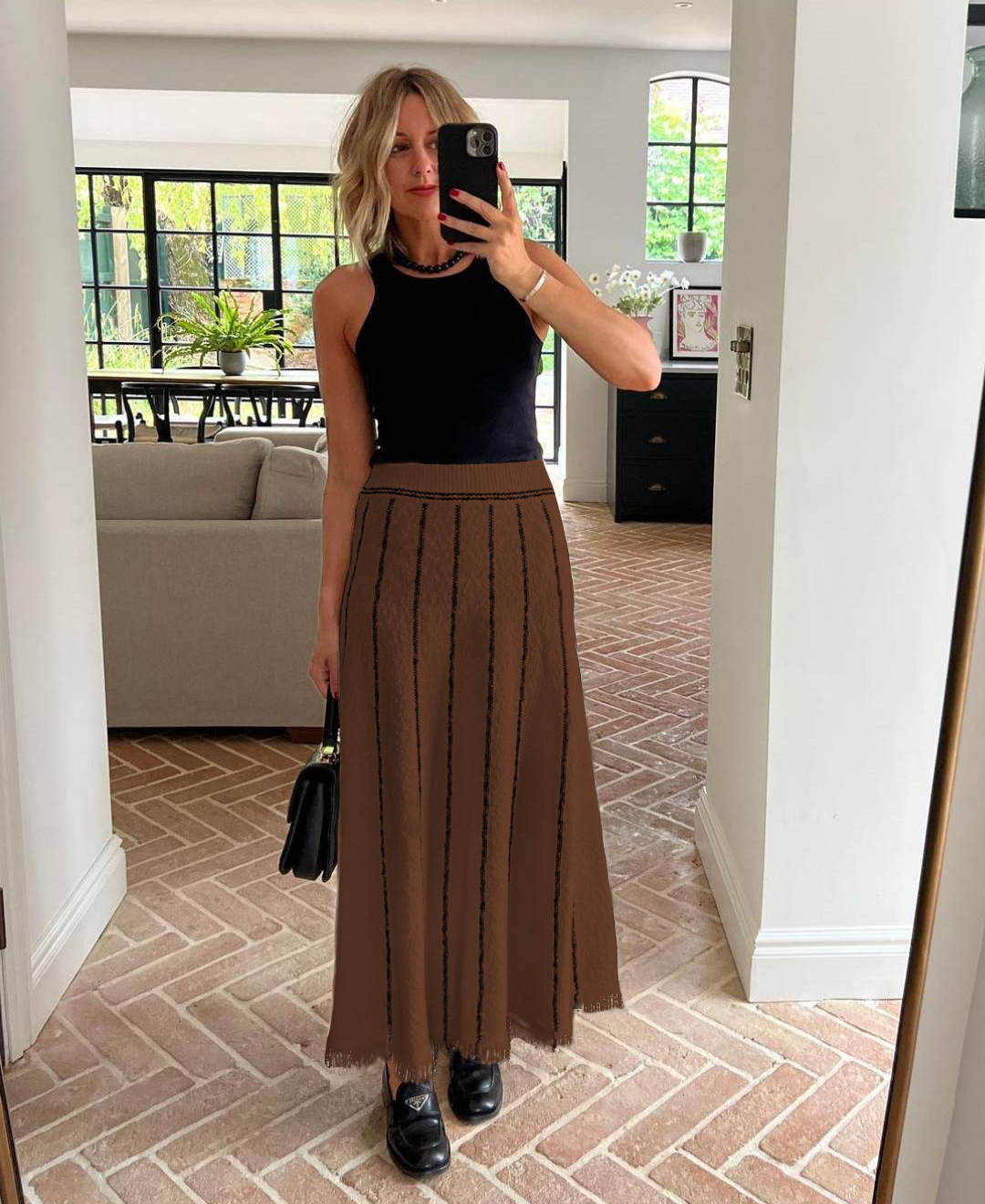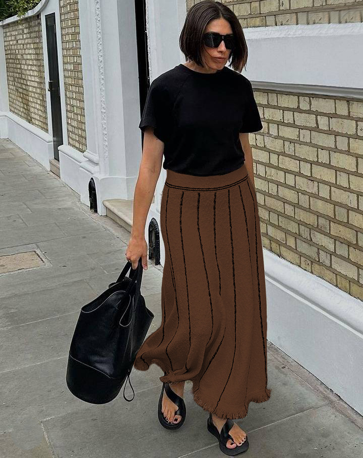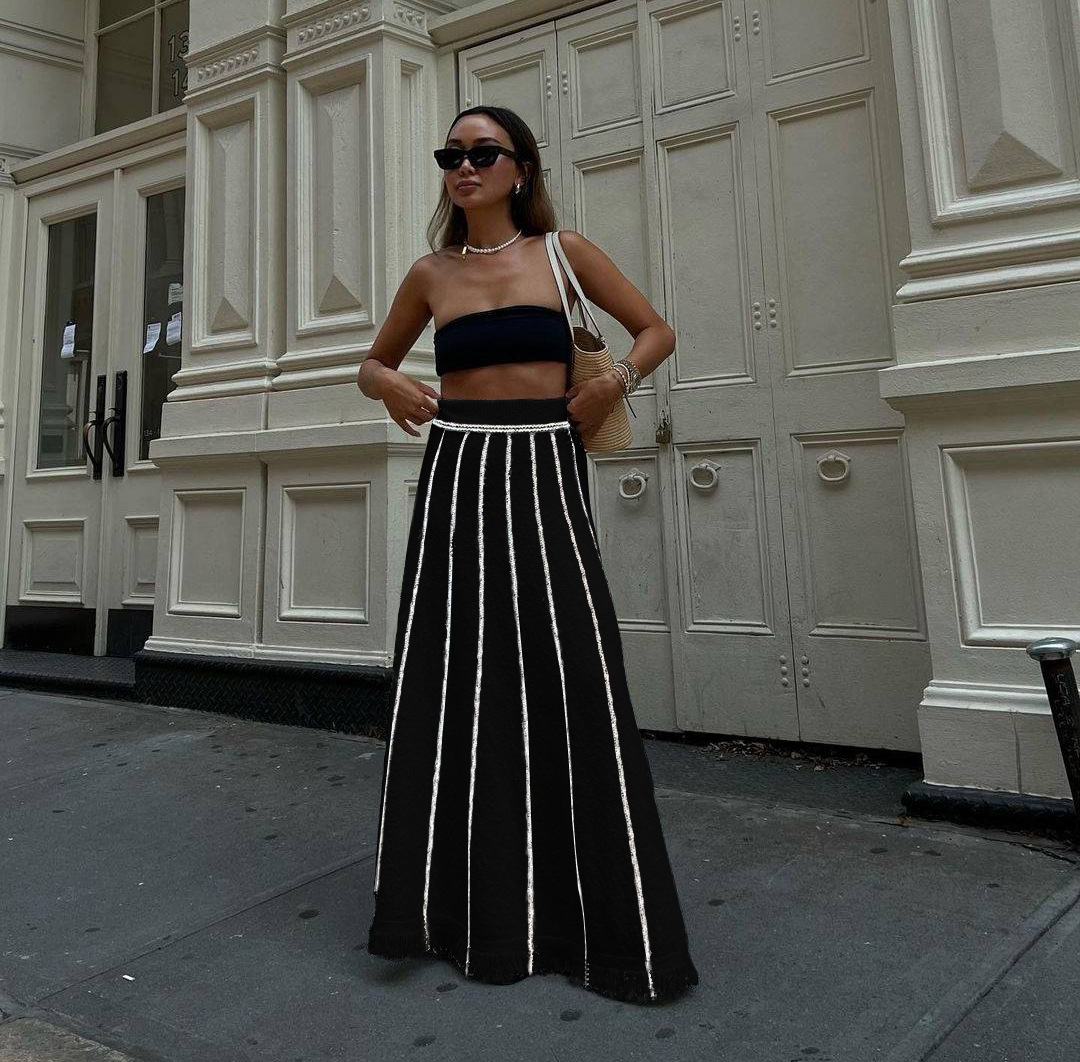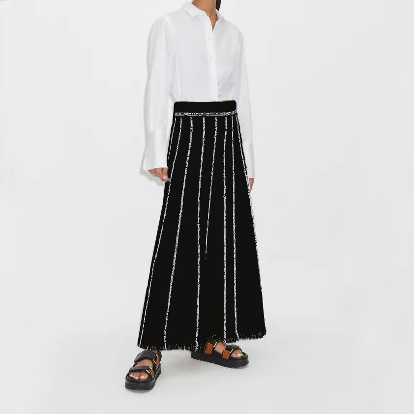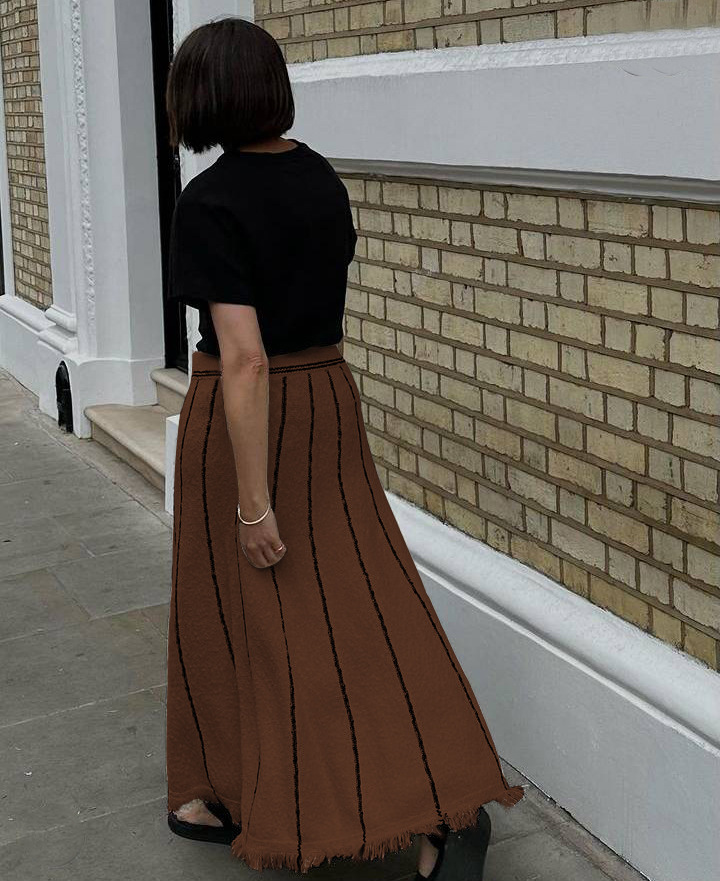 **Experience Timeless Elegance**: The Vertical Stripes Tassel Knitted Skirt is more than just a piece of clothing; it's an embodiment of grace and sophistication. Here's why it deserves a place in your wardrobe: