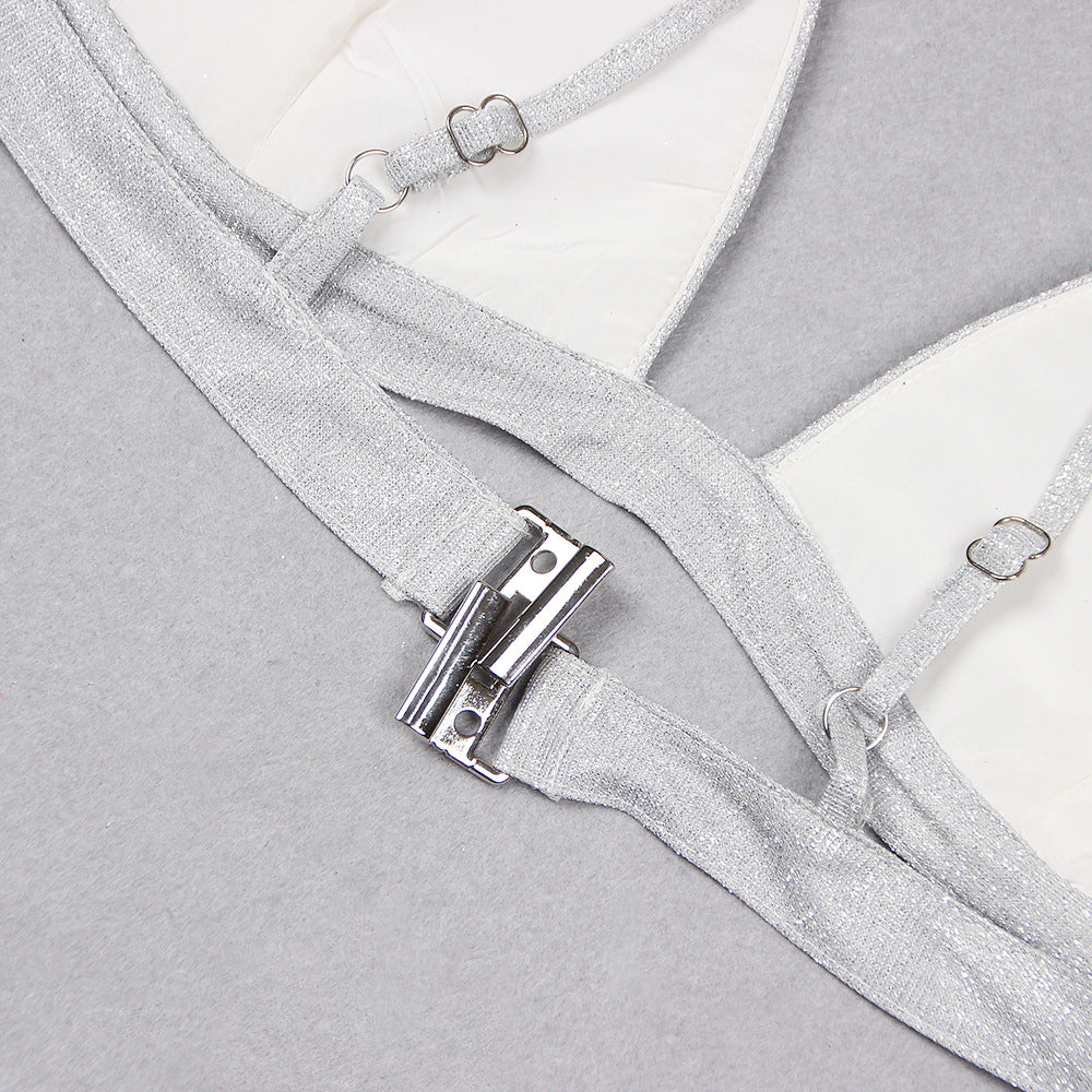 Designed with meticulous attention to detail, this three-piece set features a silver glitter blazer that dazzles with every movement. The cropped length adds a modern and trendy touch, while the wide leg pants elongate your silhouette for a flattering and elegant look. The matching crop top completes the set, creating a cohesive and eye-catching ensemble.