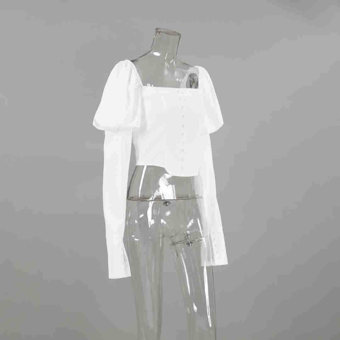The square cut collar and long puff sleeves add a touch of femininity and temperamental flair to the design. The button and smocked details enhance the overall elegance, making it an ideal choice for a range of events. Whether you're heading to a brunch date, a shopping spree, or a casual outing, this top effortlessly blends style and comfort. ✨👜