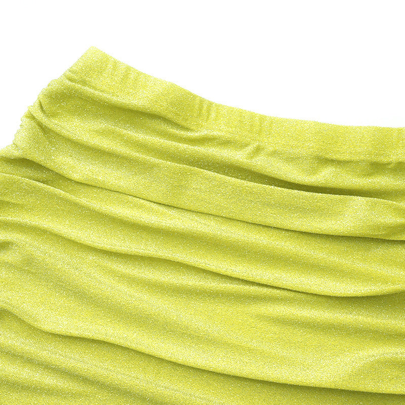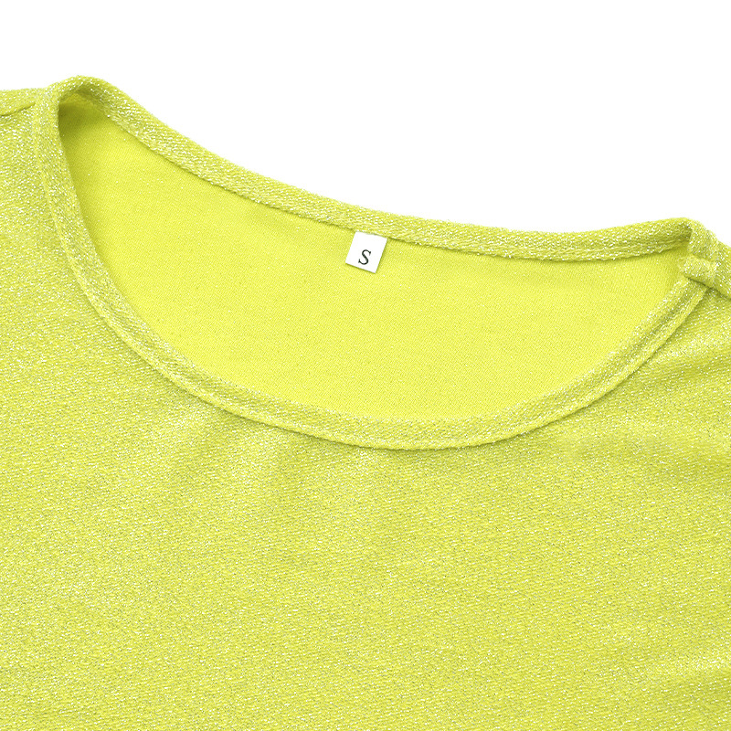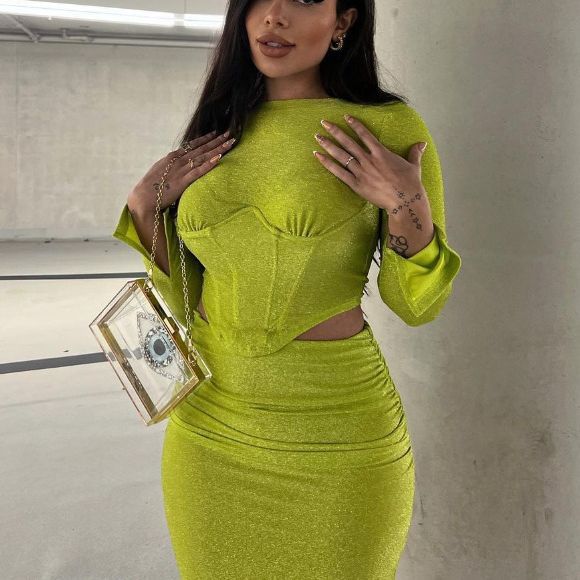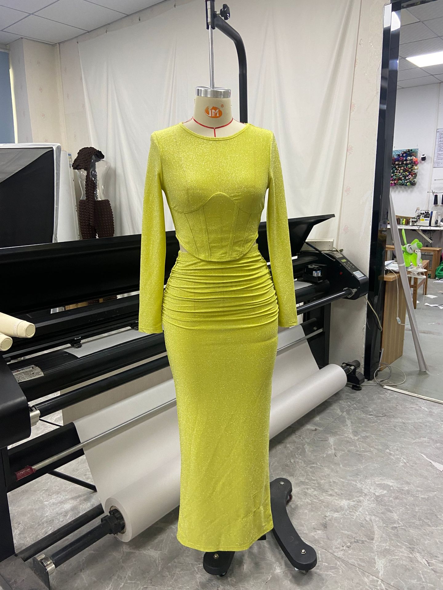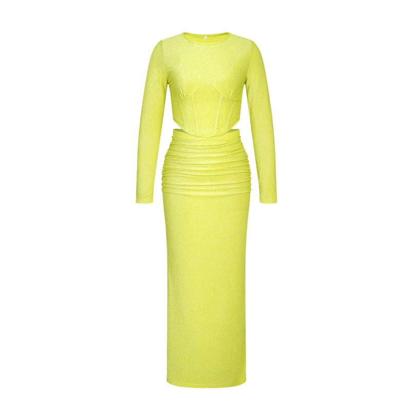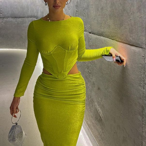 Neon Yellow Long Sleeve Crop Top Skirt Outfit 2-piece Set