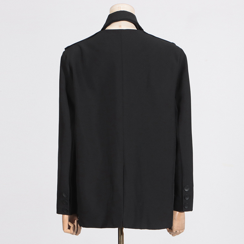 The Shoulder Button Cut Out Collar Black Blazer from TGC FASHION’s Fall 2024 collection is a standout piece that combines classic tailoring with modern, bold details. Here’s a detailed description and some styling tips: