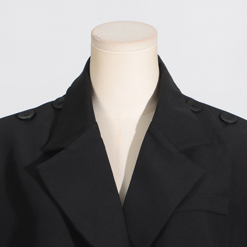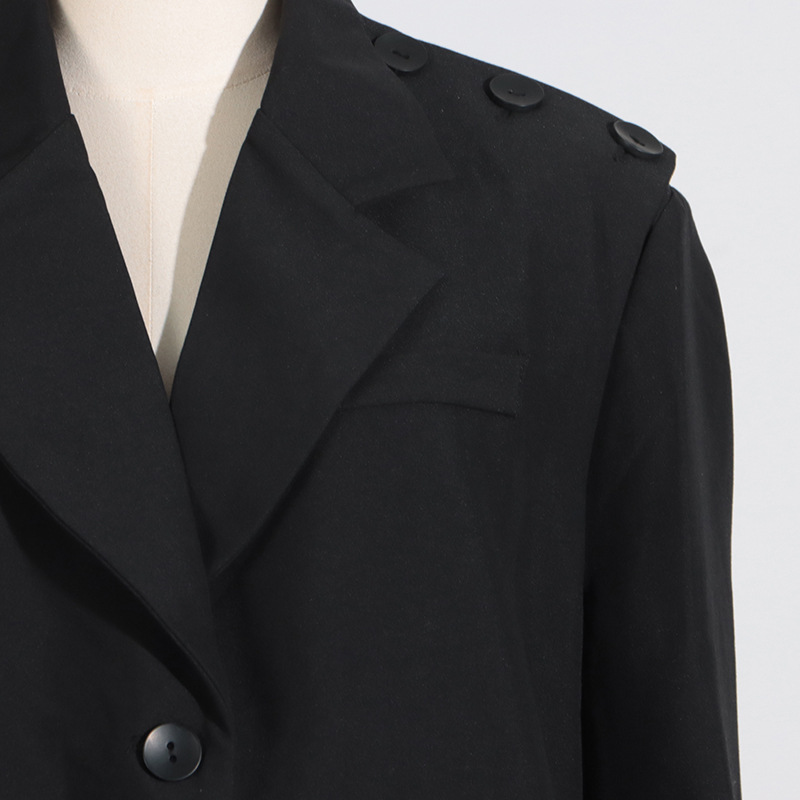 - Design: This blazer features a sleek, tailored fit that accentuates the waist, providing a polished and sophisticated silhouette. The unique cut-out collar adds a contemporary twist, while the shoulder buttons offer a touch of elegance and structure.