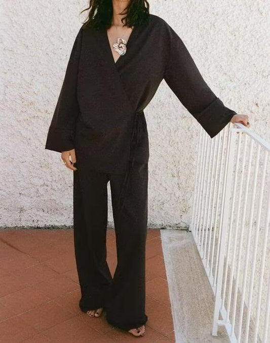 Kimono Outerwear & Straight Leg Trousers Casual Set - Loose Fit V-Neck Top with High Rise Pants | Winter 2025