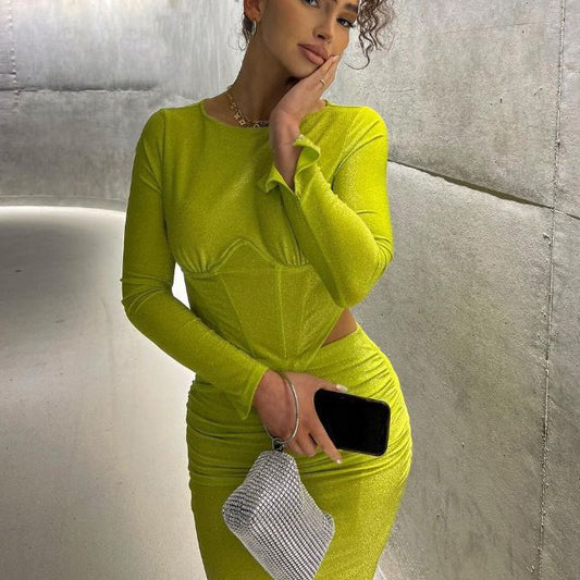 Neon Yellow Long Sleeve Crop Top Skirt Outfit 2-piece Set