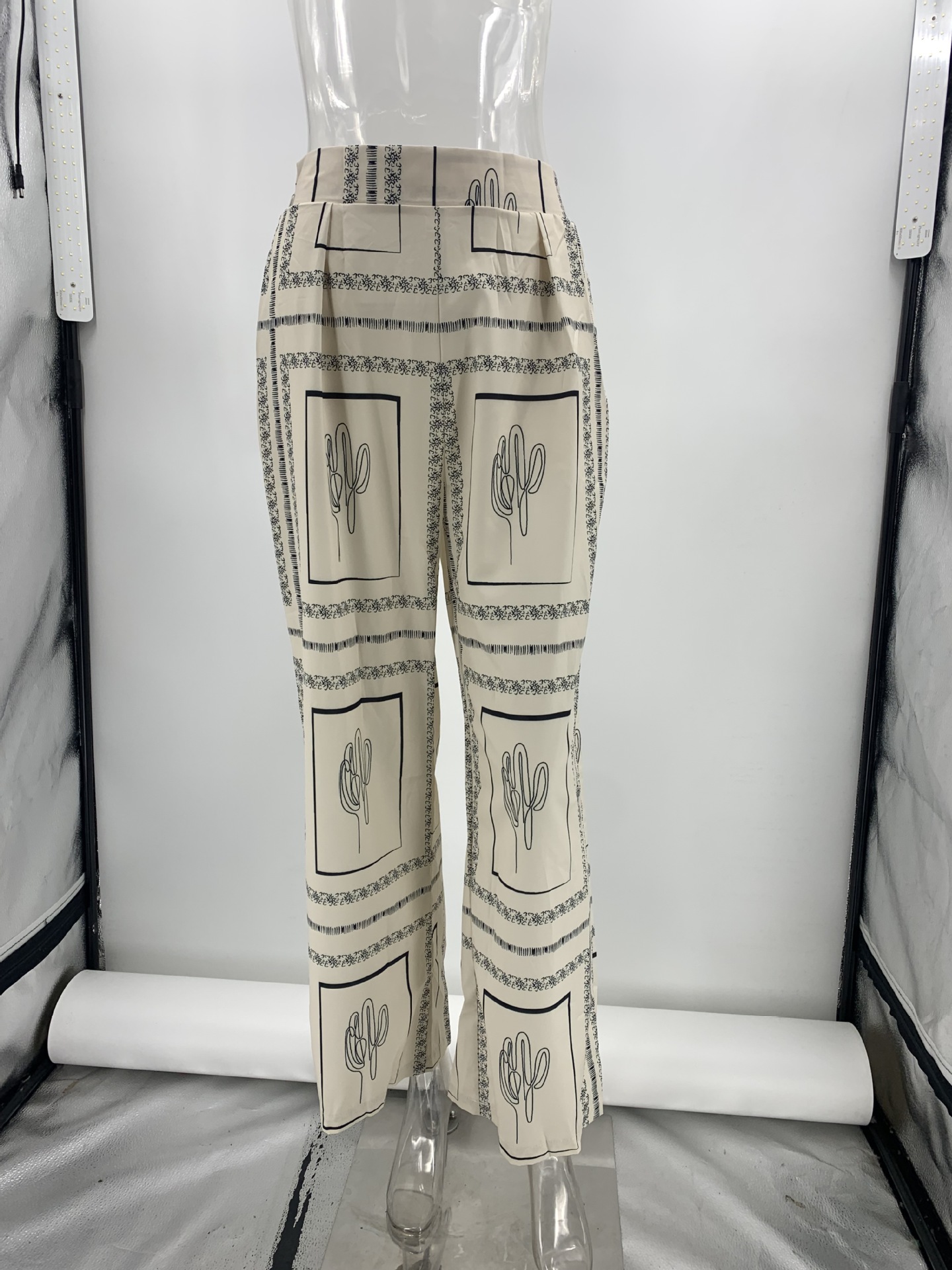 Paired with the matching high-rise trousers, which also boast the line art pattern, this outfit exudes effortless charm. The full-length pants provide a flattering fit with a loose, relaxed silhouette perfect for the spring and fall seasons.