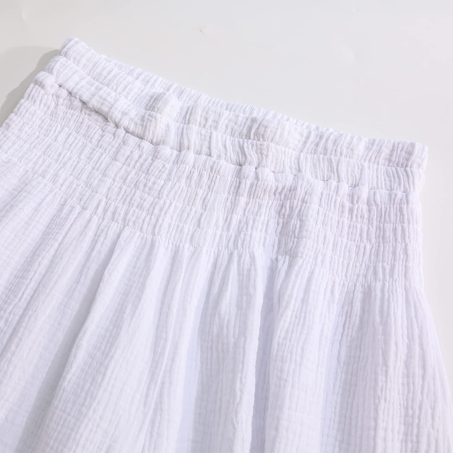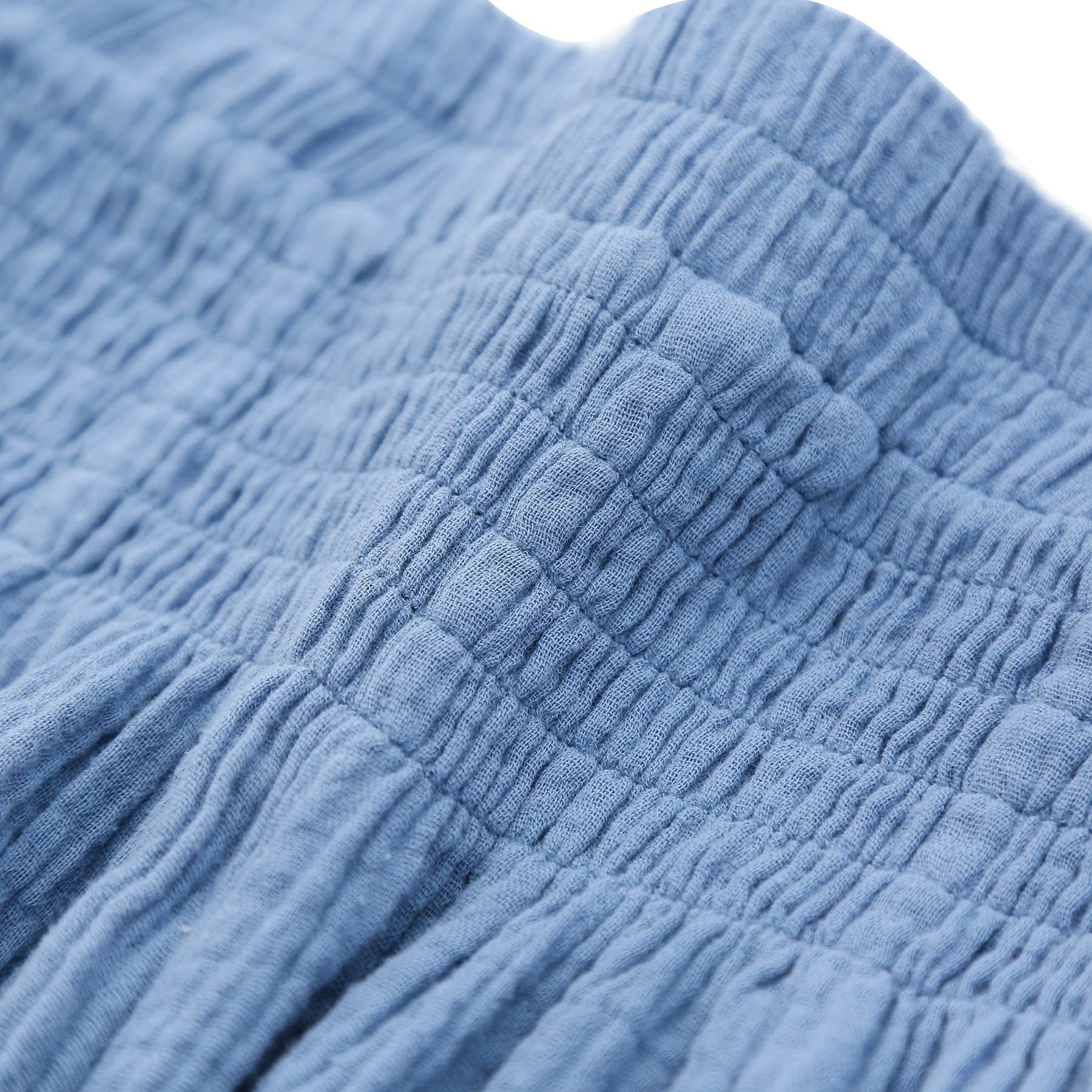 The pants have a high waist design, which is elasticated, providing a comfortable fit and making them easy to put on and take off. The double layer gauze fabric is lightweight and airy, adding to the breathability and comfort of the pants. They are ideal for casual occasions, such as running errands, lounging at home, or spending time with friends.