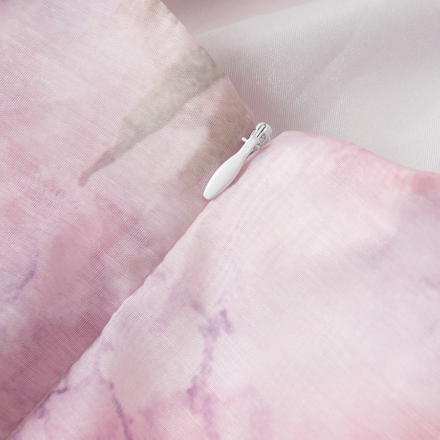 - Features: Tie waist, lace-up back, 3D floral accents, asymmetric ruffle hem