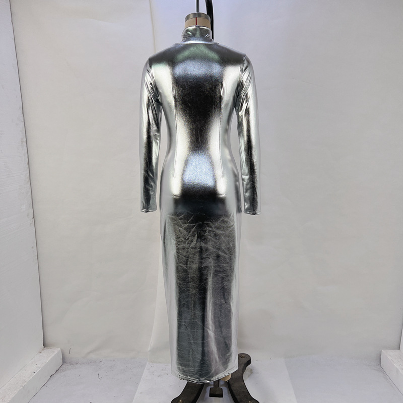 Y2K Fall Outfits | Silver Metallic Turtleneck Maxi Dress