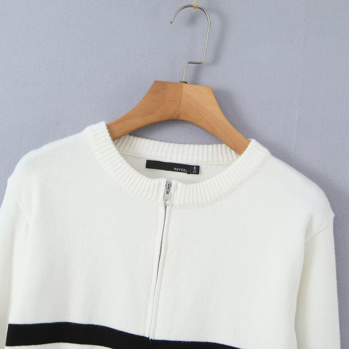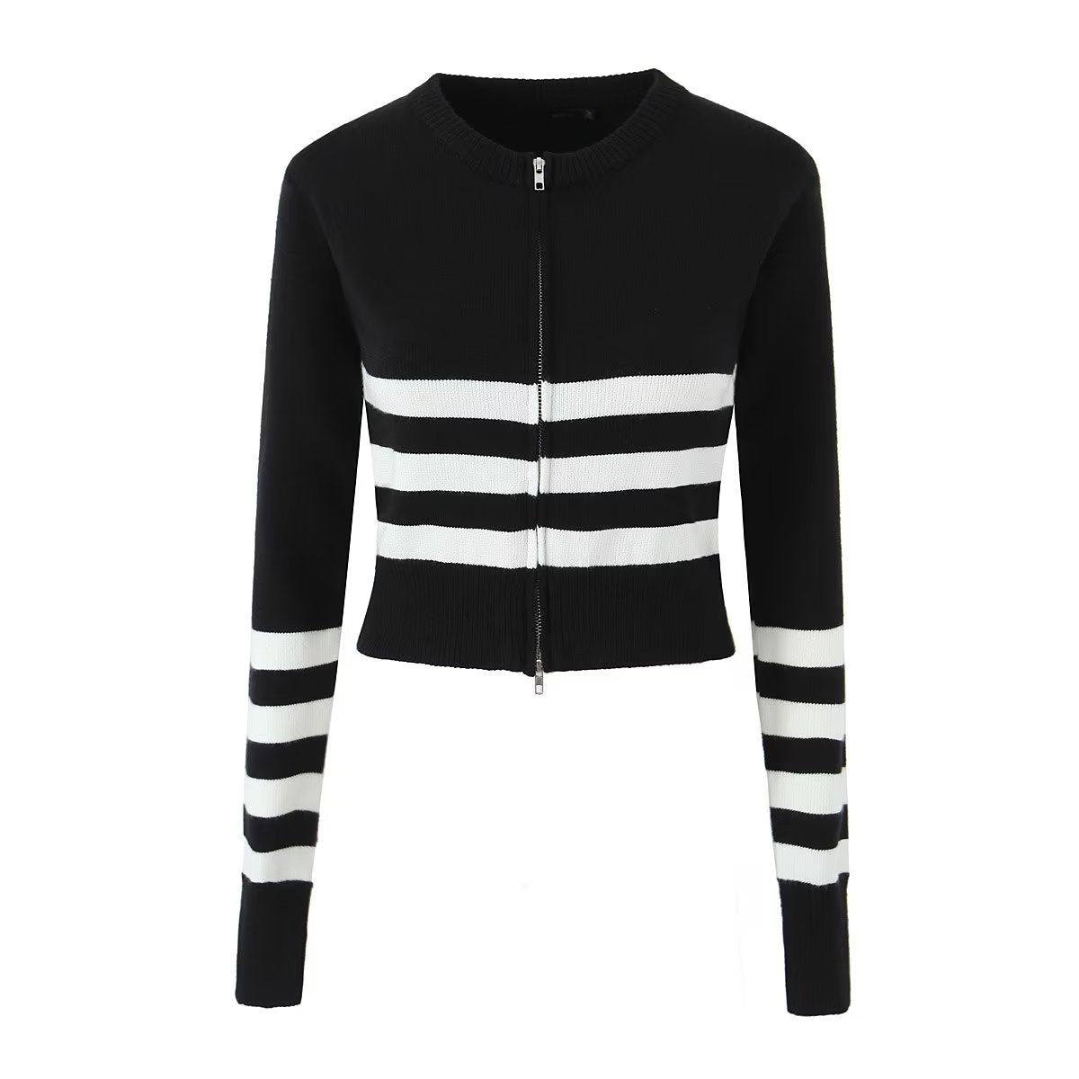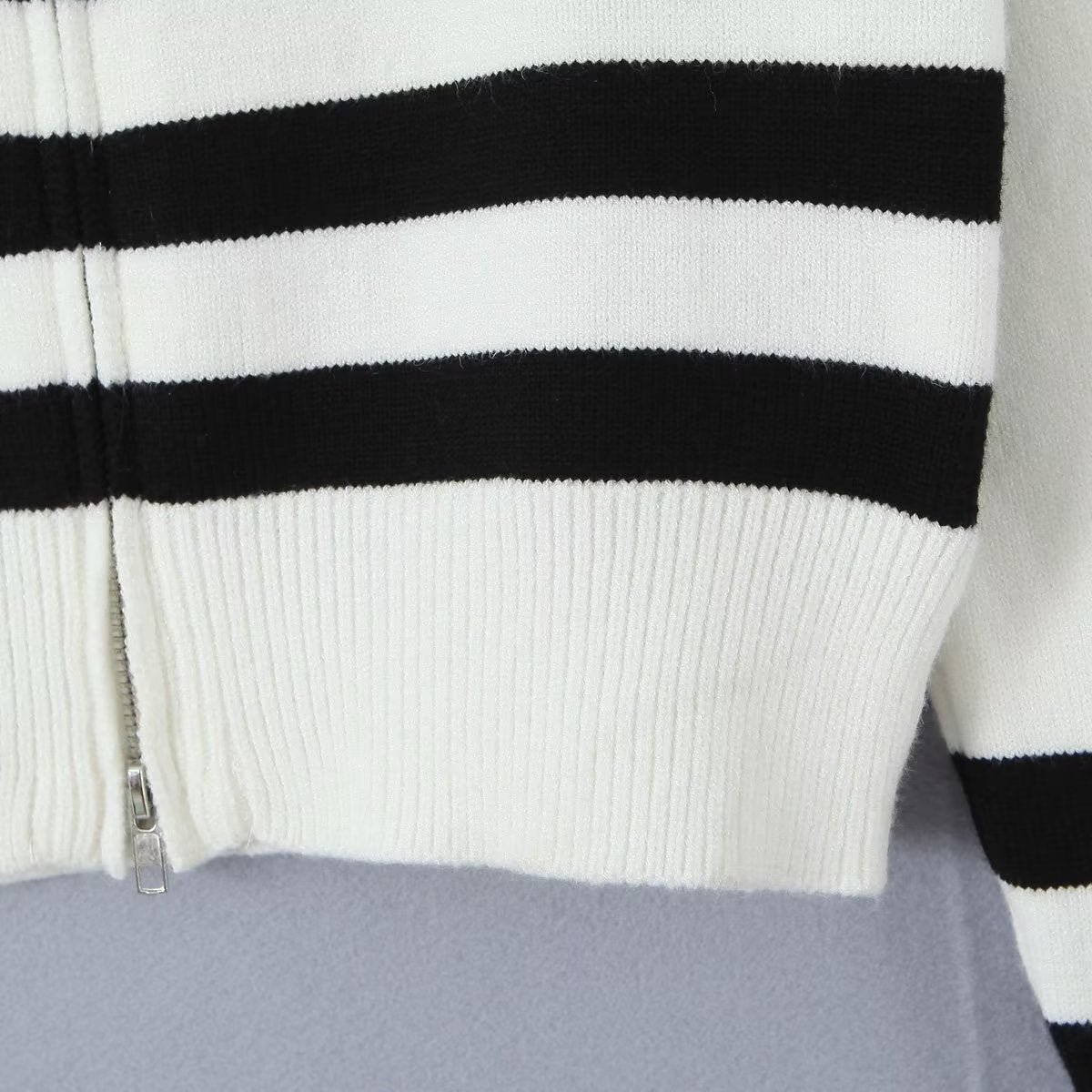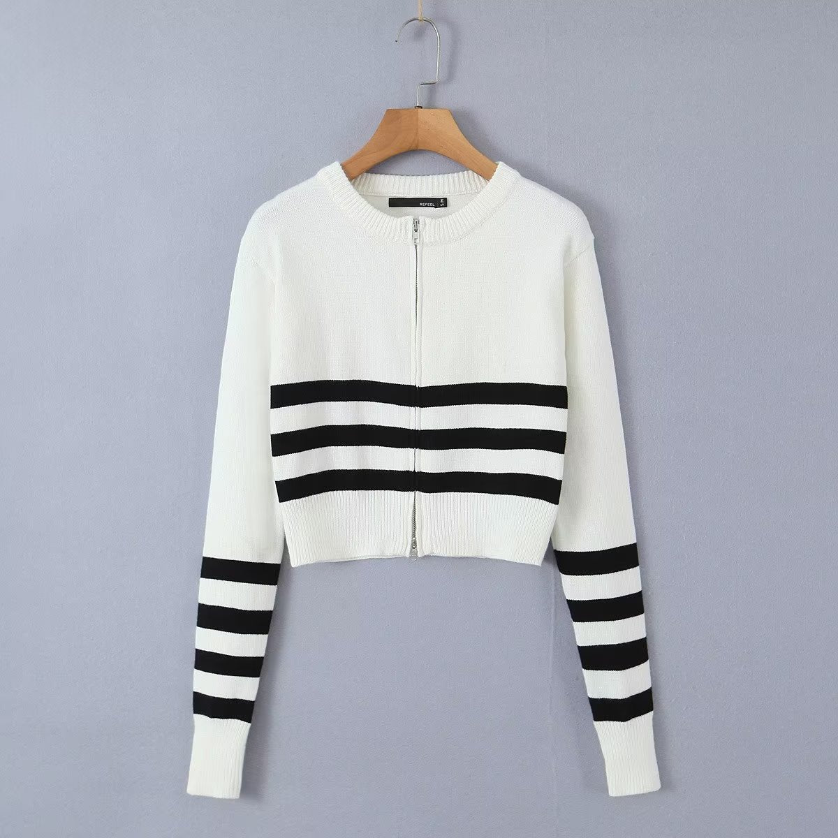 Introducing the 2023 Fashion Trend: Classic Striped Cardigan Crop Top, a versatile and chic piece that embodies casual elegance.