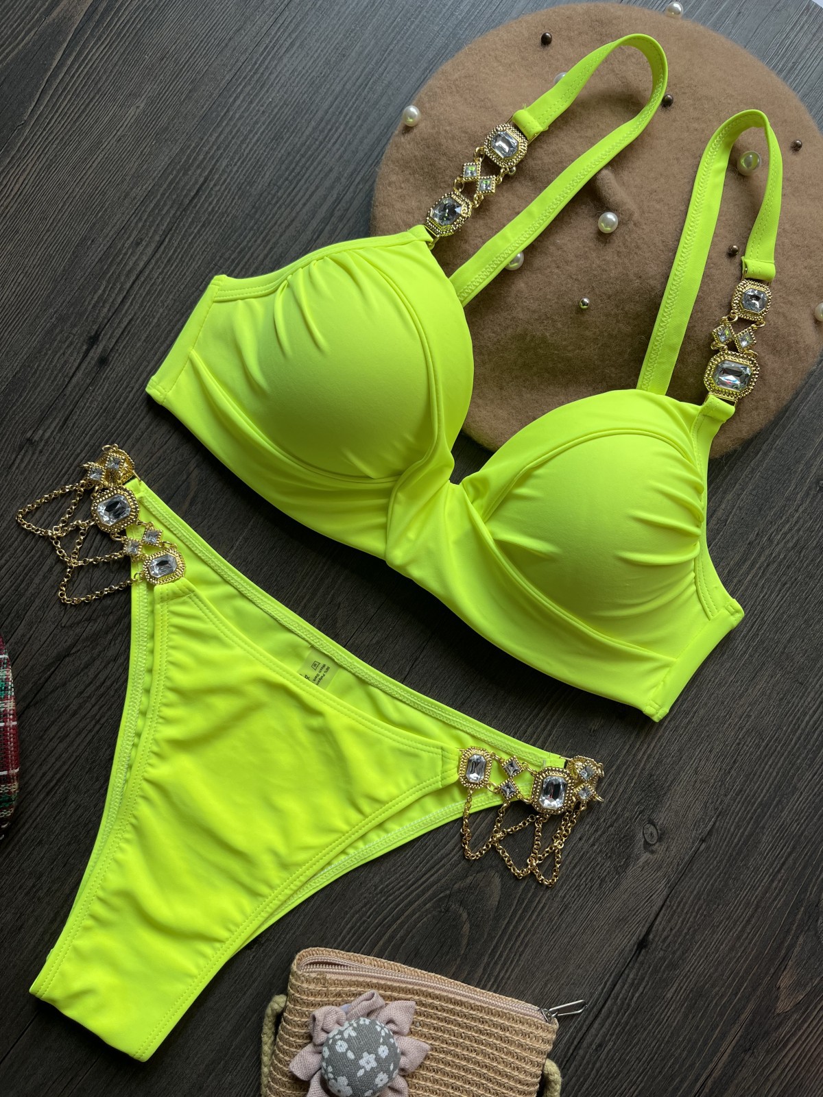 Summer Outfits 2023 | Neon Yellow Aesthetic Rhinestones Diamond Gems Bikini Swimsuit