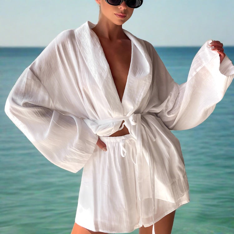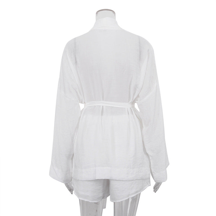 Experience ultimate style and sophistication with our Spring/Summer French two-piece suit. This elegant and exclusive outfit features a long-sleeved lace-up top and loose shorts, showcasing a solid color and belted element. Made with high-quality polyester fabric, this set is perfect for the fashion-forward individual. Elevate your wardrobe this Spring/Fall season with our luxurious and tasteful ensemble.