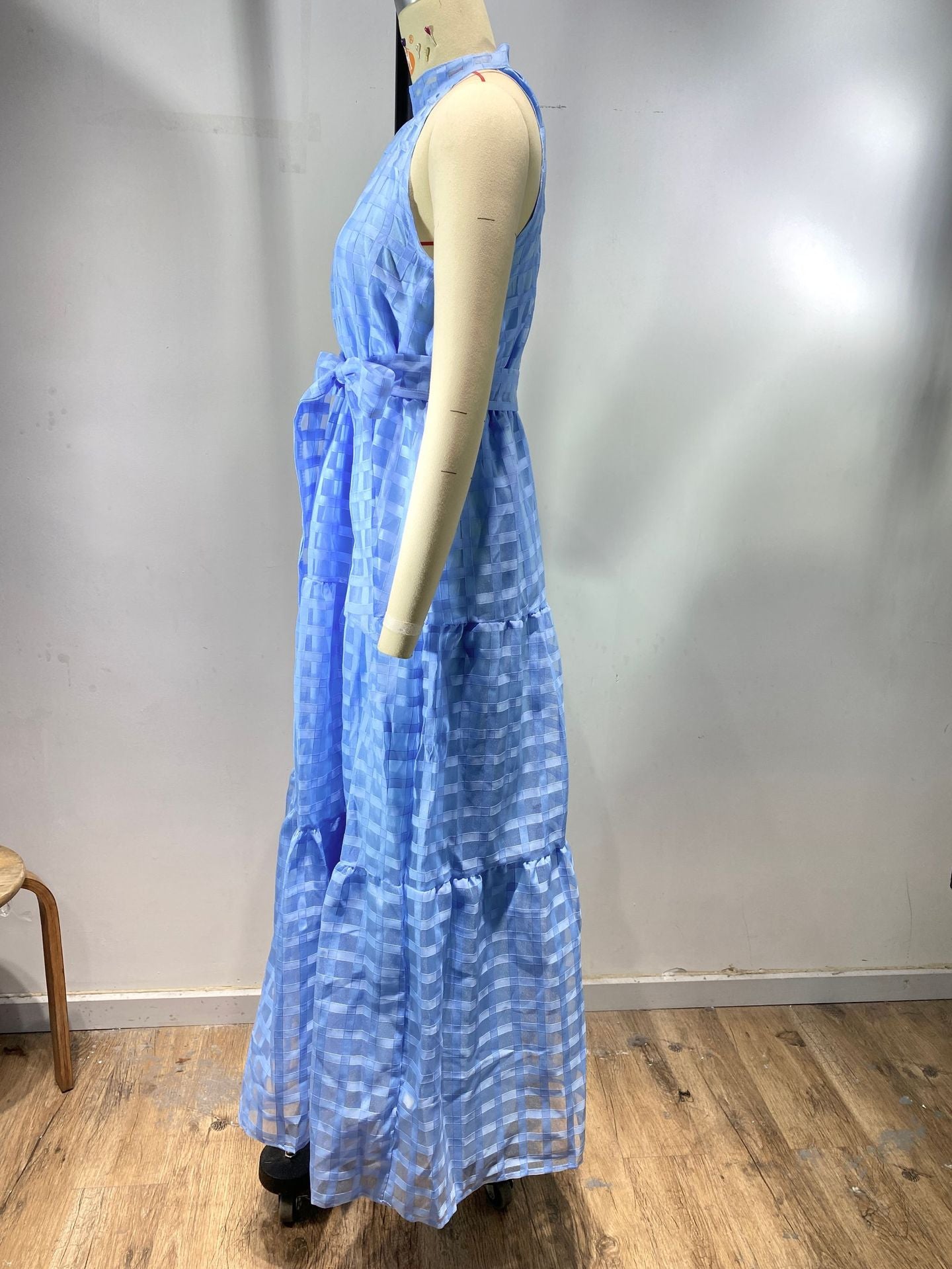 This dress features a stunning combination of pink and white plaid, giving it a retro and chic vibe. The long maxi length creates an elegant and graceful look, while the sleeveless design is perfect for keeping cool on hot summer days.