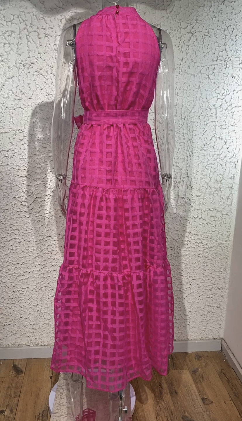 Introducing our latest hot pink solid color plaid retro maxi dress, perfect for the summer season and 2023 fashion trends.
