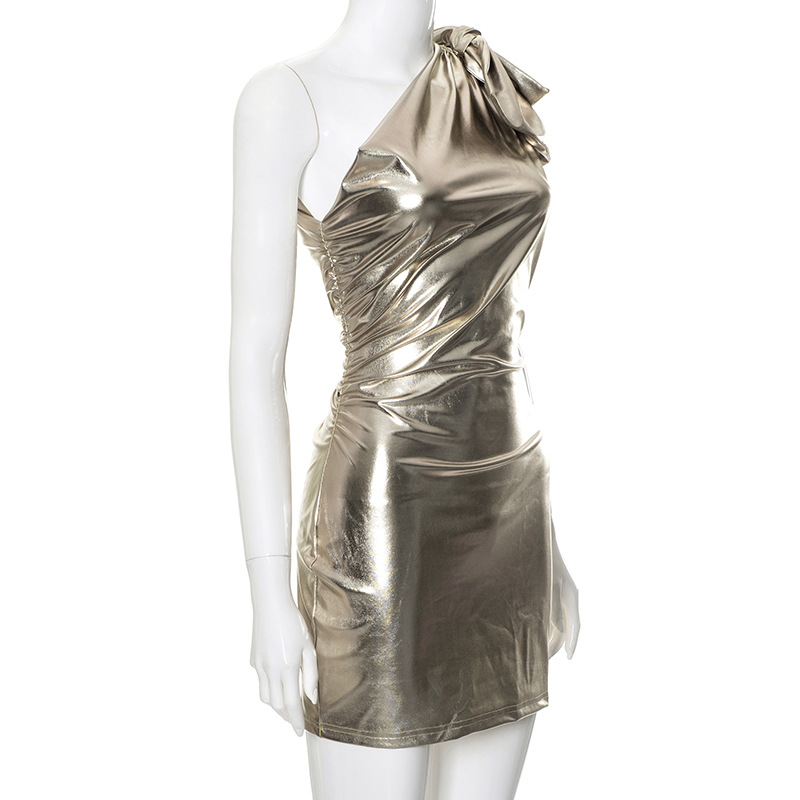Crafted to captivate, this dress boasts a striking one-shoulder design, amplified by a metallic finish that radiates an opulent allure. The standout feature, a 3D bow detail, adds a touch of luxury and character, elevating the dress to a symbol of refined glamour.