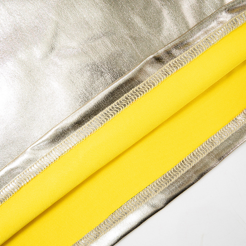 The figure-hugging silhouette accentuates curves while offering a comfortable fit, showcasing the perfect blend of allure and sophistication. Its metallic sheen exudes opulence, perfect for those seeking a bold yet elegant style statement.