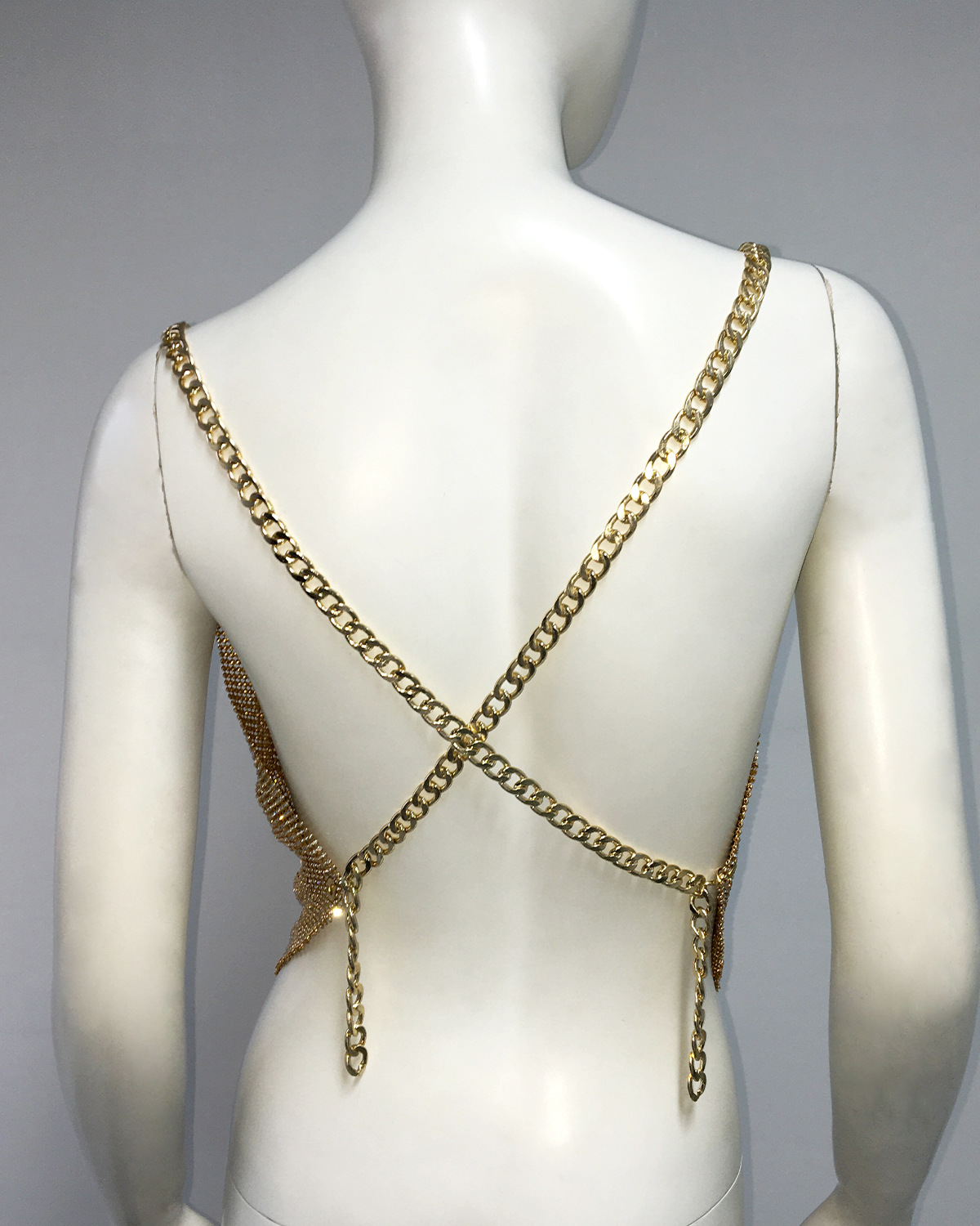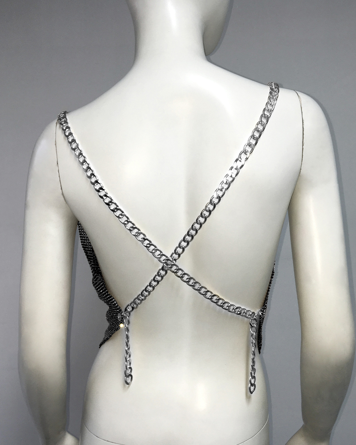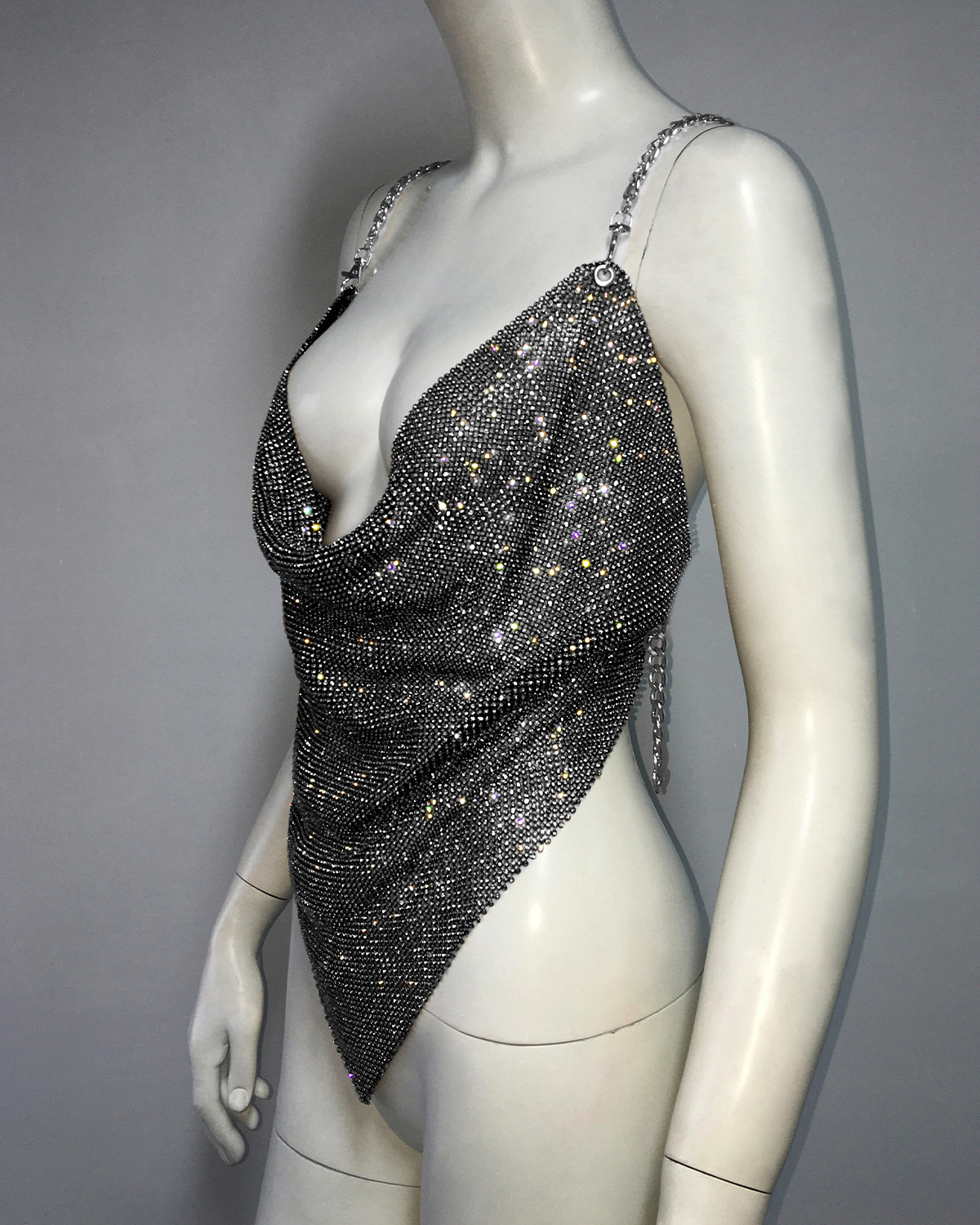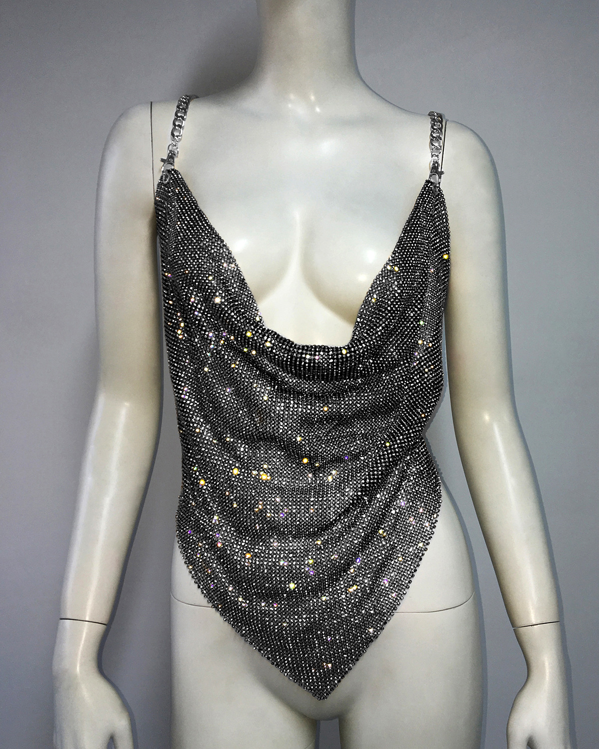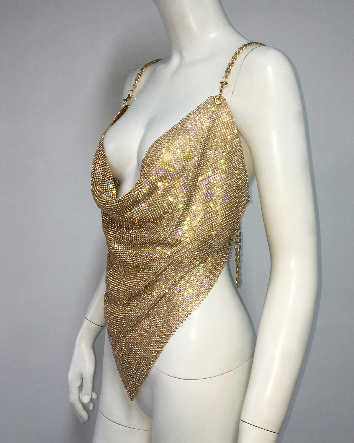 Pair this top with your favorite bottoms, whether it's a chic skirt for a night out or stylish trousers for a more casual look. Elevate your wardrobe and make a statement with this metallic rhinestone backless top that's bound to turn heads and set trends.