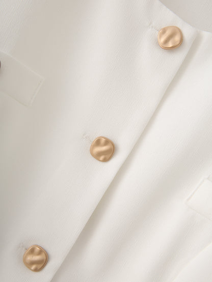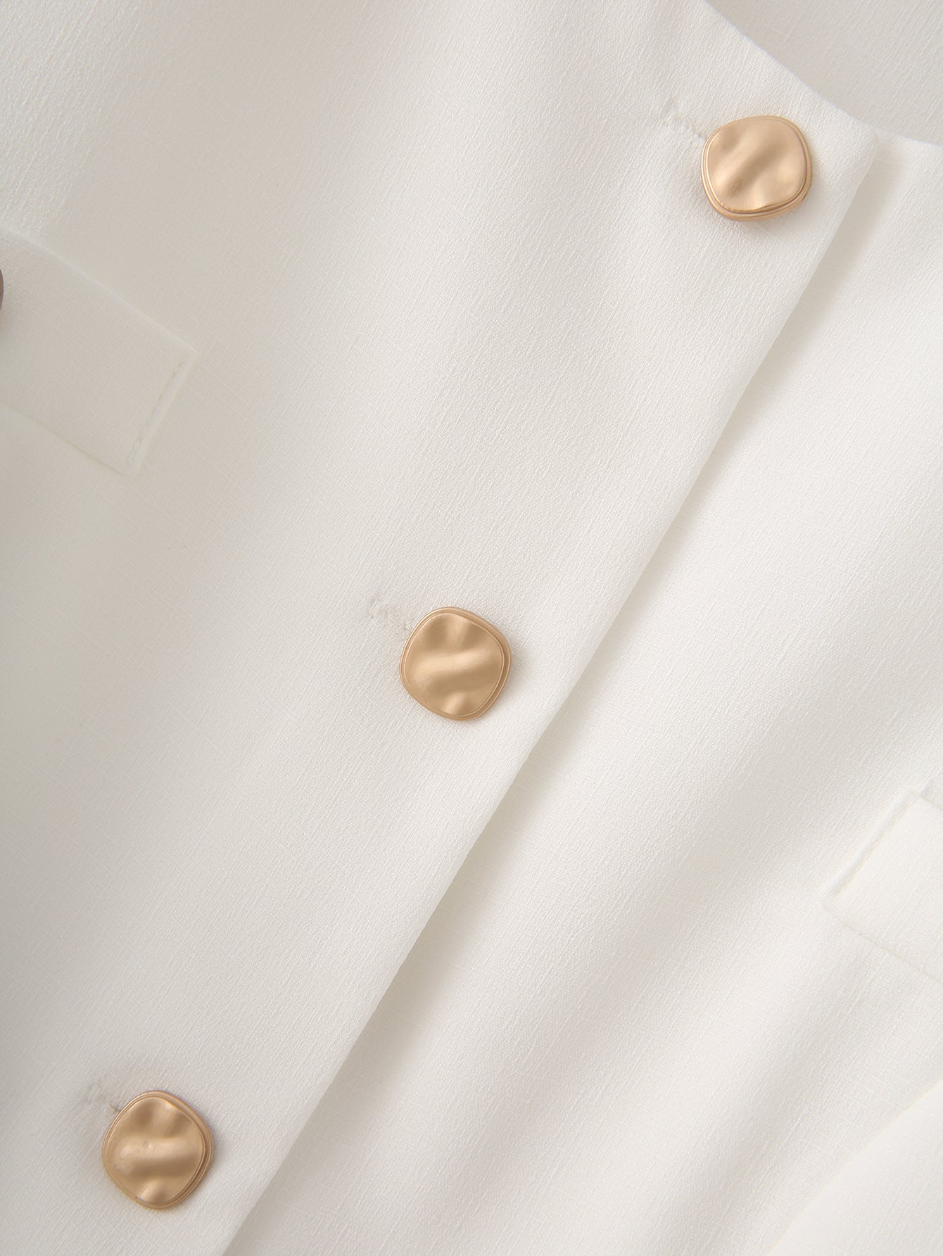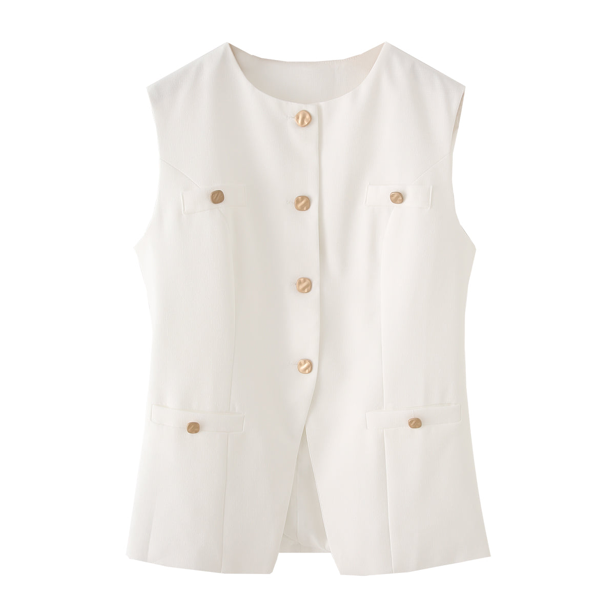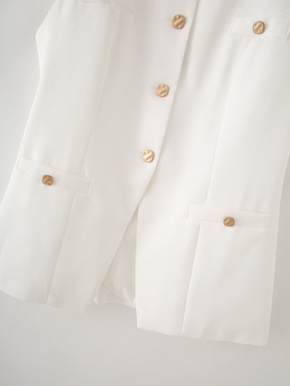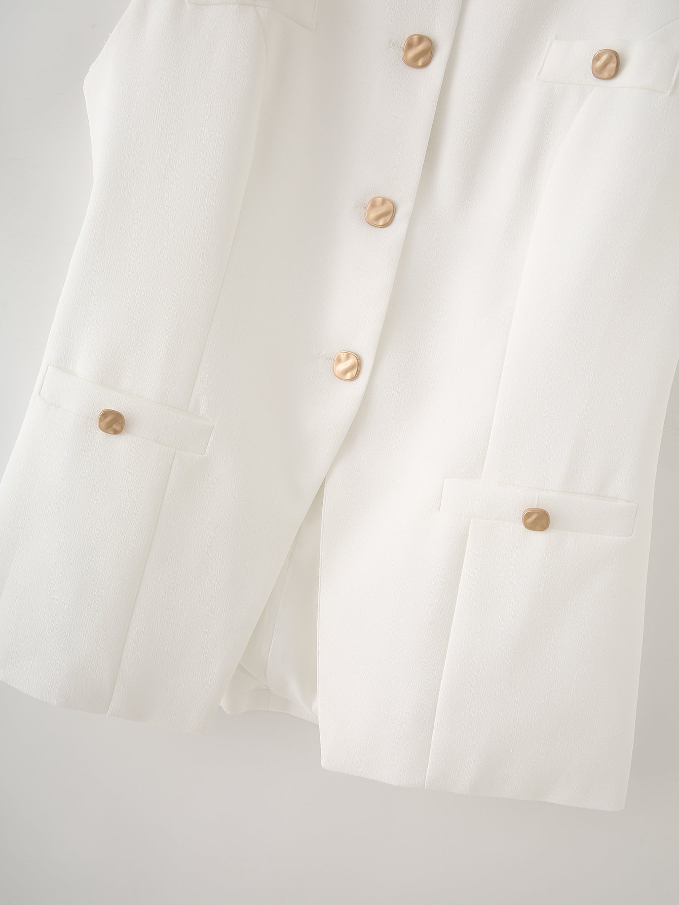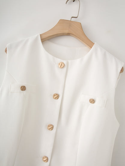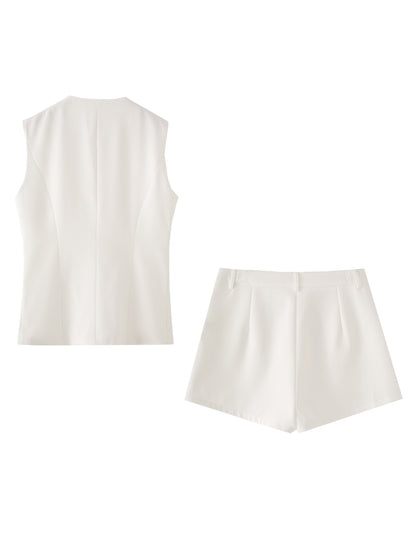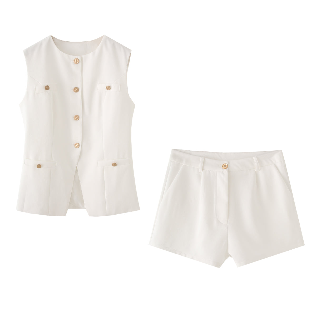 Step into summer with the Boss Off-Duty Set—a sleek two-piece featuring a round neck, single-breasted vest and high-rise tailored shorts. This sleeveless power set blends casual confidence with clean lines, gold-tone buttons, and minimalist structure for that quiet luxury vibe.