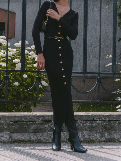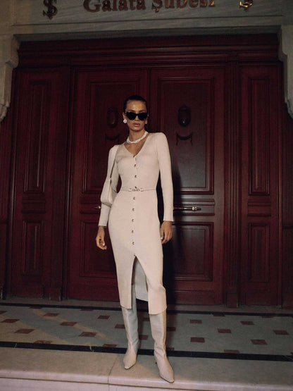 Burgundy Spring 2025 | Long Sleeve Knitted Button Split Sweater Dress – Sleek Russian-Inspired Silhouette