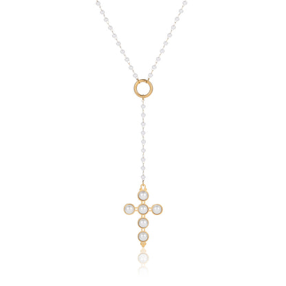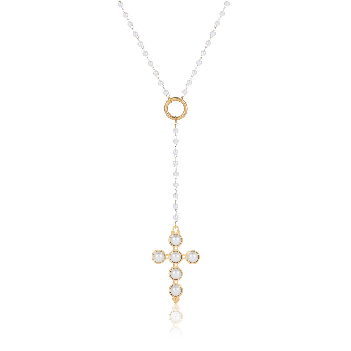 Celeste Cross & Pearl Clavicle Necklace – Retro Adjustable Stainless Steel Chain