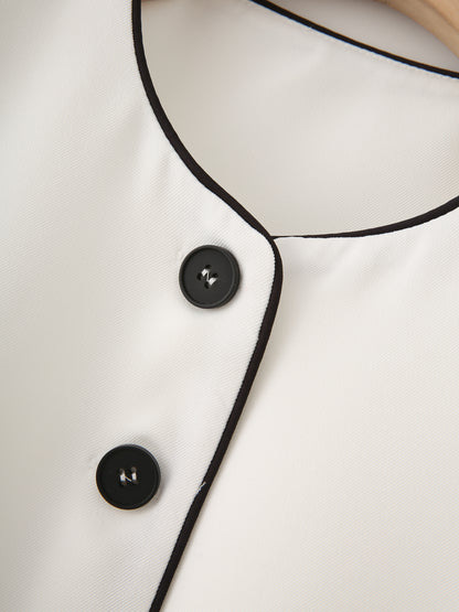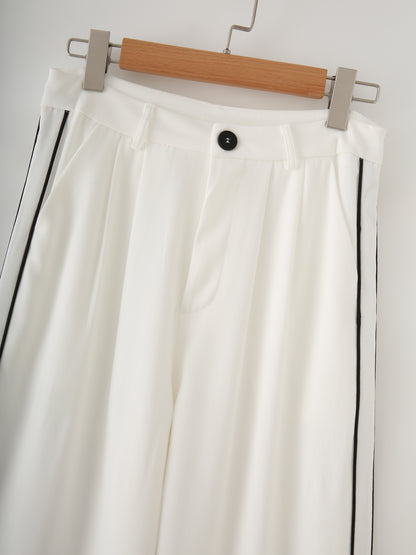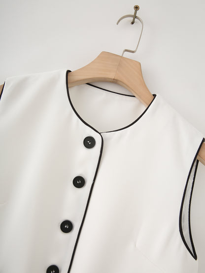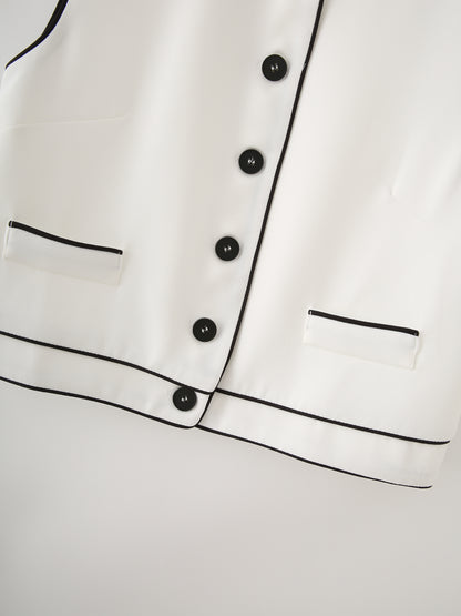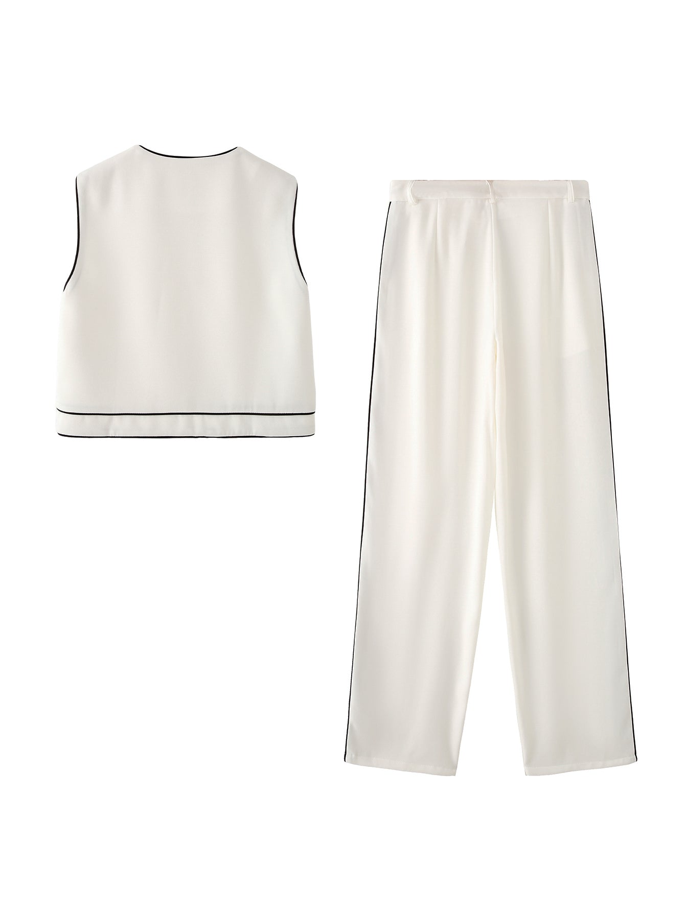 Level up your summer wardrobe with the Edge Stitch Set, a bold and breezy two-piece look made for easy slay days. Featuring a contrast-trim, round-neck vest and high-rise striped trousers, this set is all about sharp lines and smooth vibes. The single-breasted design, handy pockets, and full-length pant silhouette keep it effortlessly tailored with a casual twist.