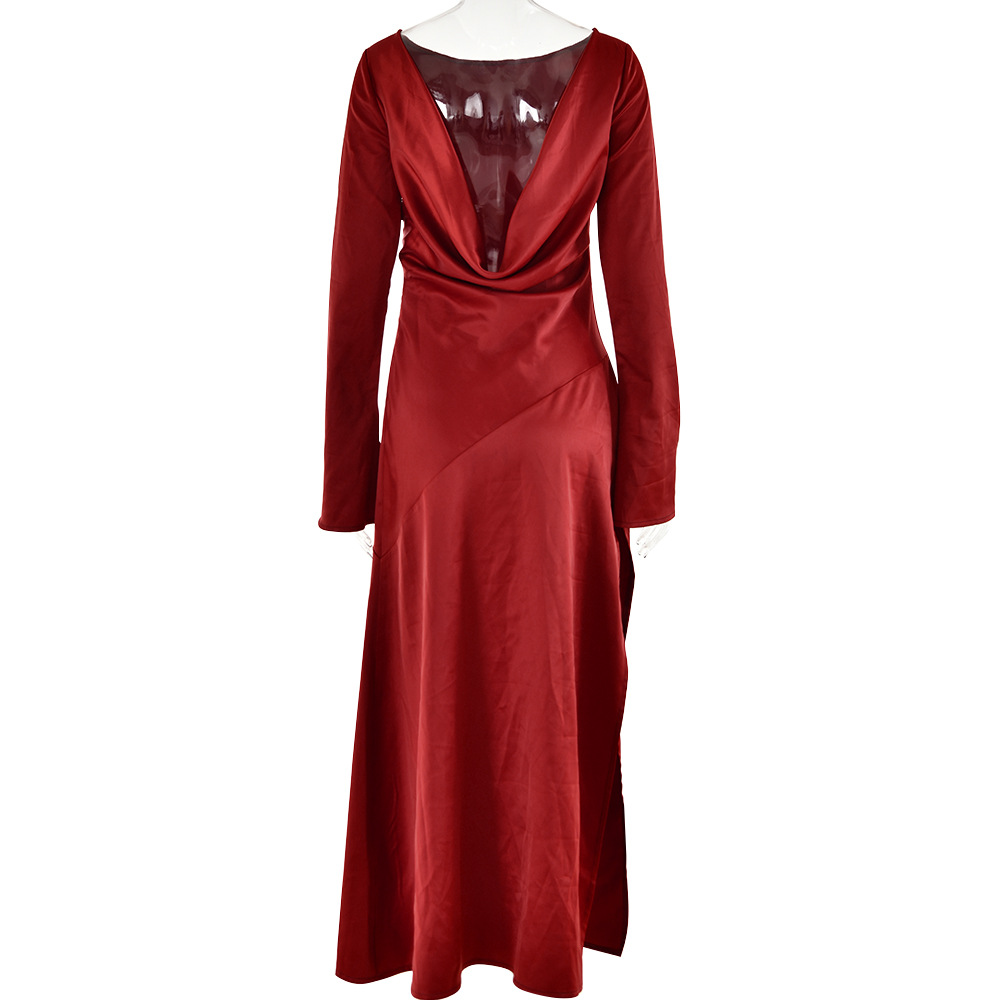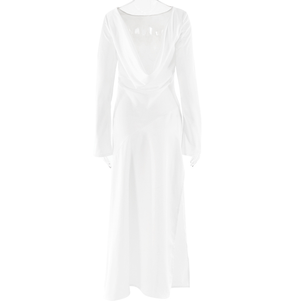 With a crew neckline and long sleeves, this attire encapsulates a refined modesty while the graceful backless and slit details add a touch of allure. The maxi length enhances its formal appeal, making it a versatile piece suitable for a spectrum of events, from formal gatherings to evening galas.