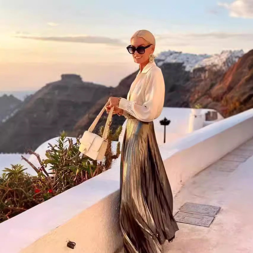 Elegant Satin Long Sleeve Shirt & Glossy Metal Skirt Set - Color Block High Rise Maxi Skirt for Women
