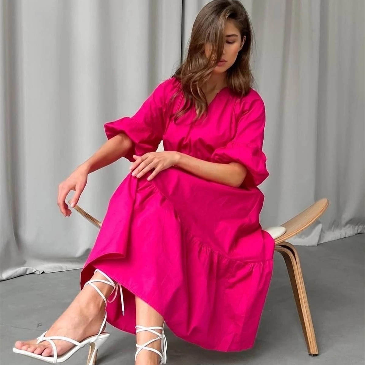 The half sleeves provide a modest and chic look, while still allowing you to stay cool and comfortable in the summer heat. The midi length adds a touch of refinement, making it suitable for both formal and casual settings.