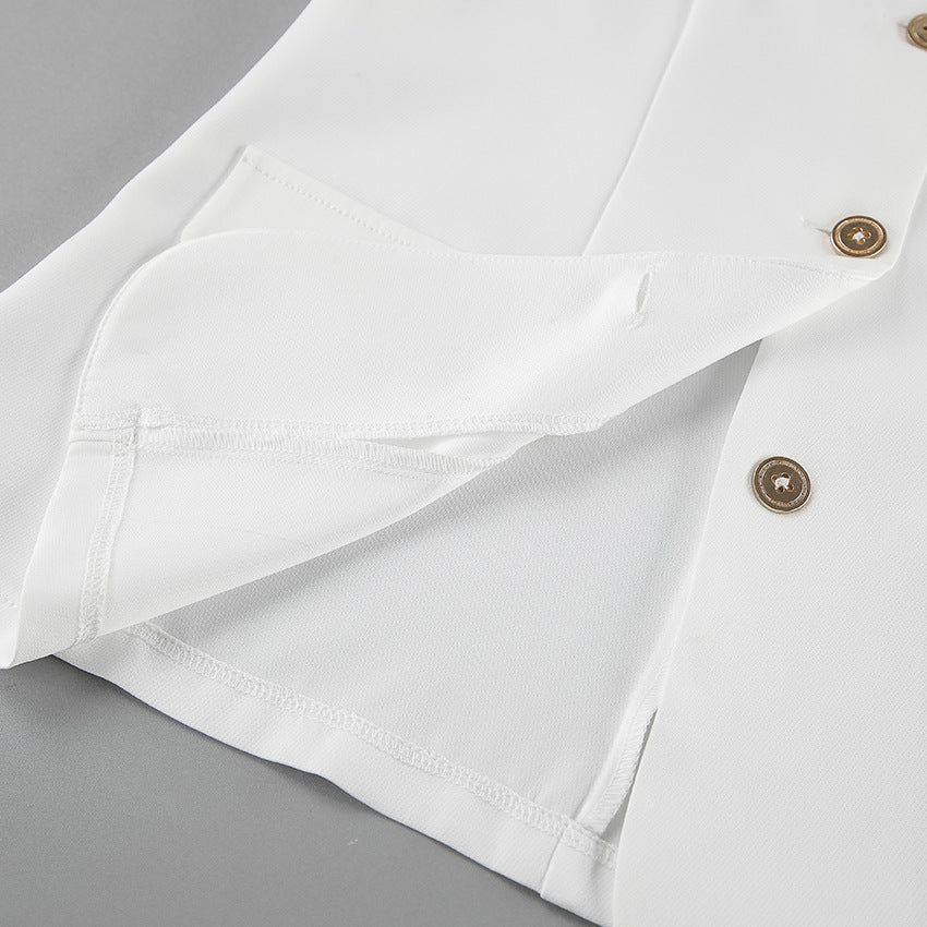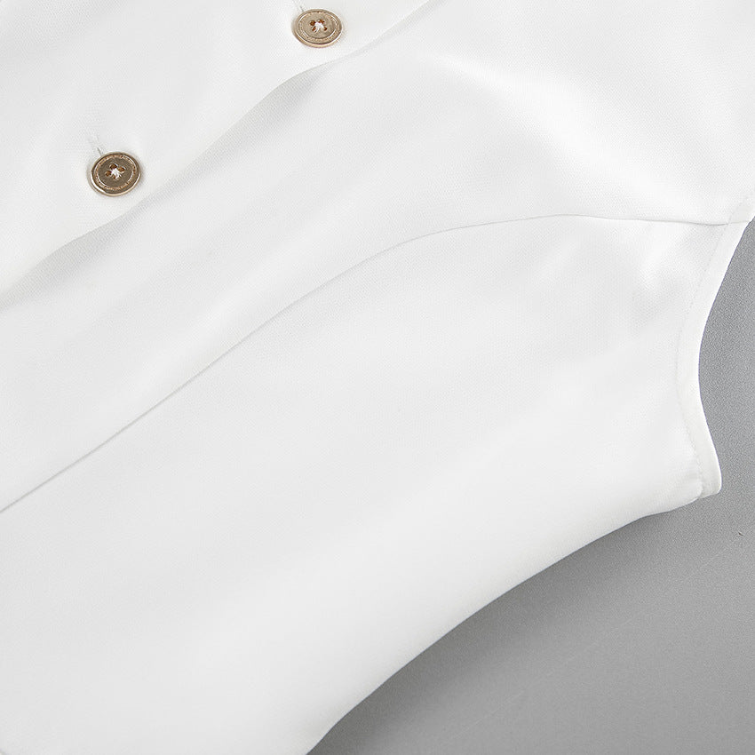 Step into warm weather style with the Elegant White Stand Collar Sleeveless Vest Shirt, a crisp and refined staple for your spring and summer wardrobe. Designed with a slim fit and modern small stand collar, this sleeveless top features a classic single-breasted button front and subtle pocket detail for effortless polish.