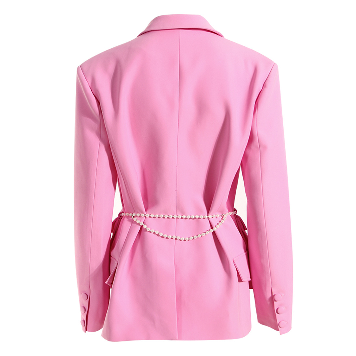 - **Spring/Fall Essential:** As a versatile piece that effortlessly bridges the gap between seasons, the Pink Pearl Pockets Chain Long Blazer is a must-have in any fashion-forward wardrobe.