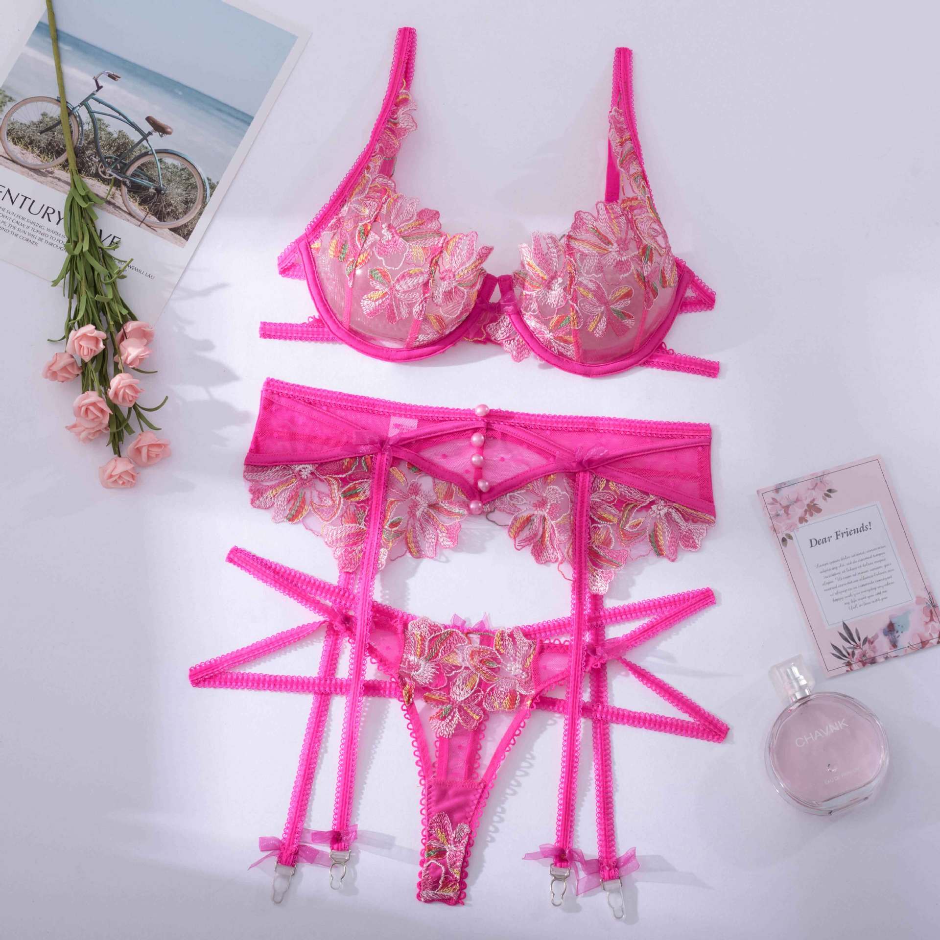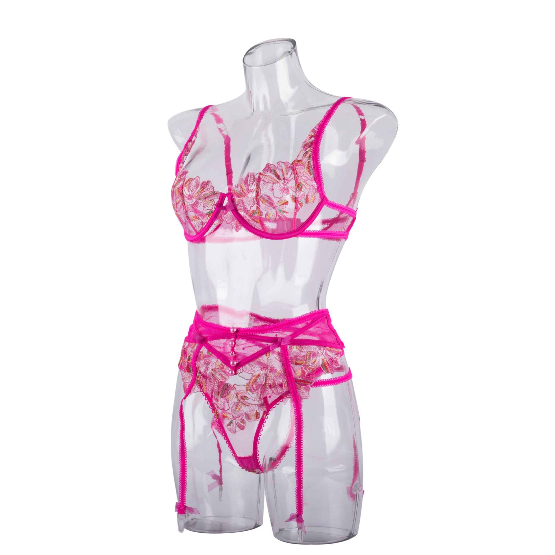 Lingerie Outfits | Hot Pink Floral Lingerie Outfit 3-piece Set
