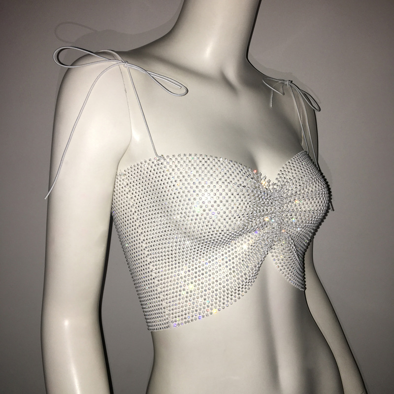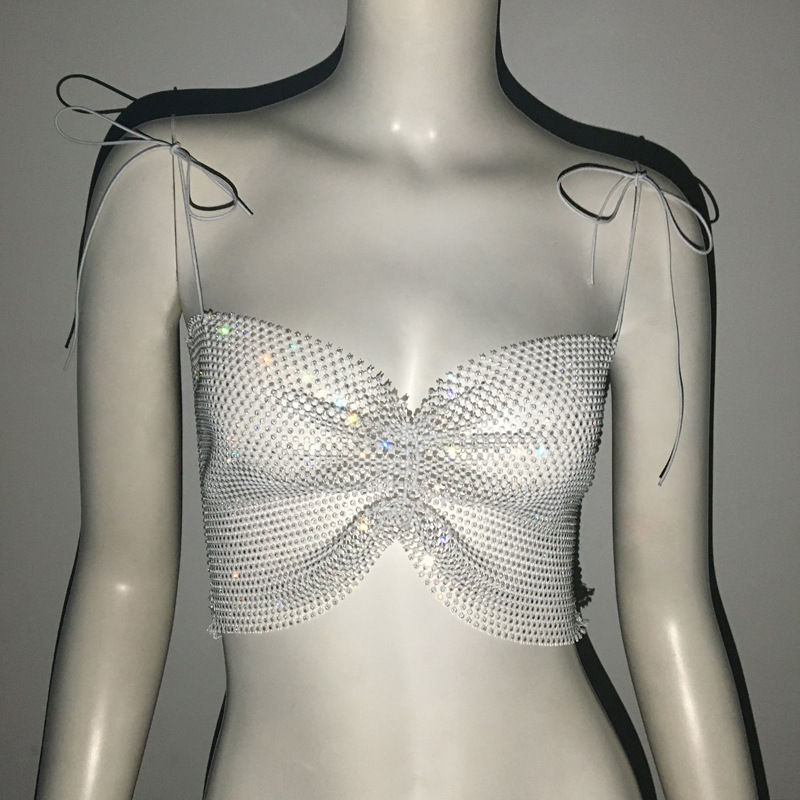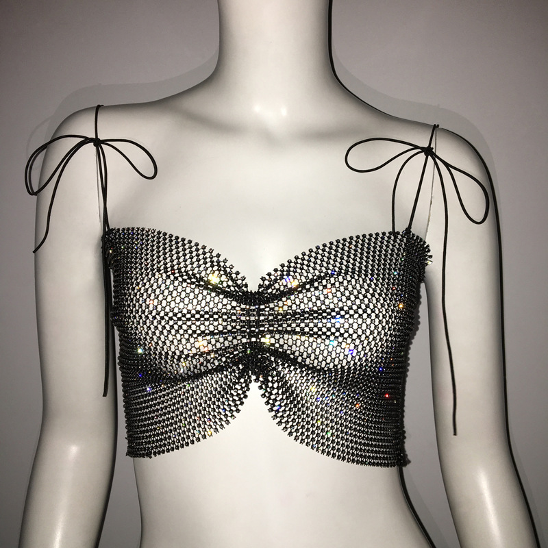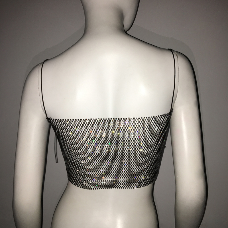 - Autumn Winter Sexy Hollow Out Cutout Sexy Rhinestone Chest-Wrapped Mesh Rhinestone Fishnet Sling Sexy Top