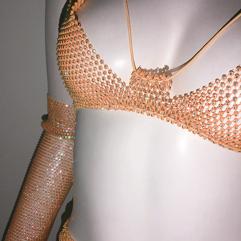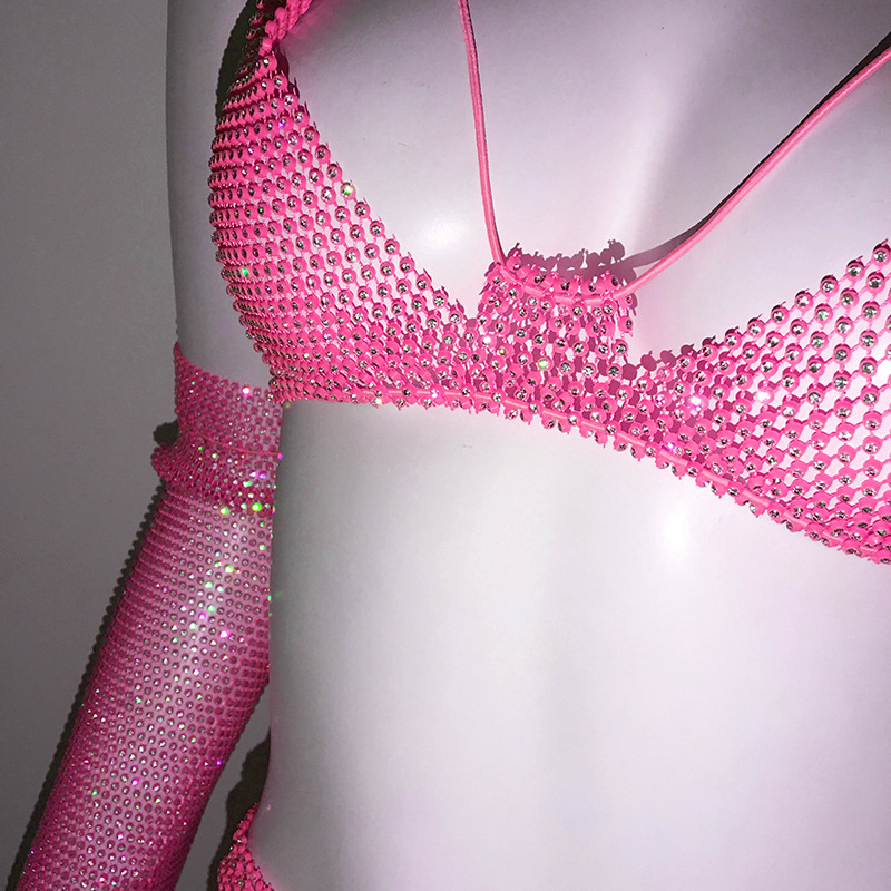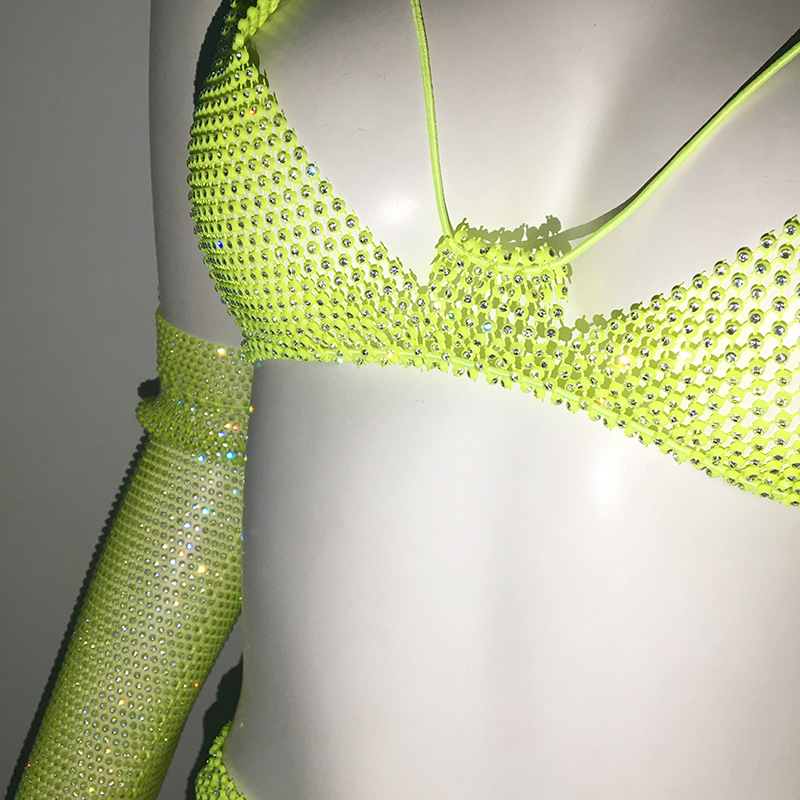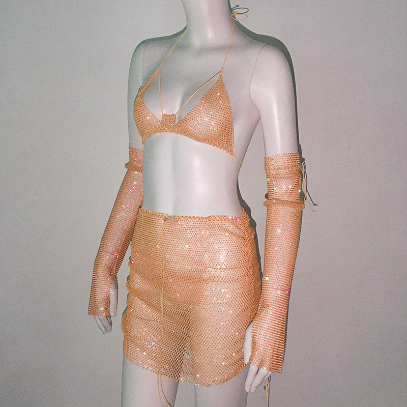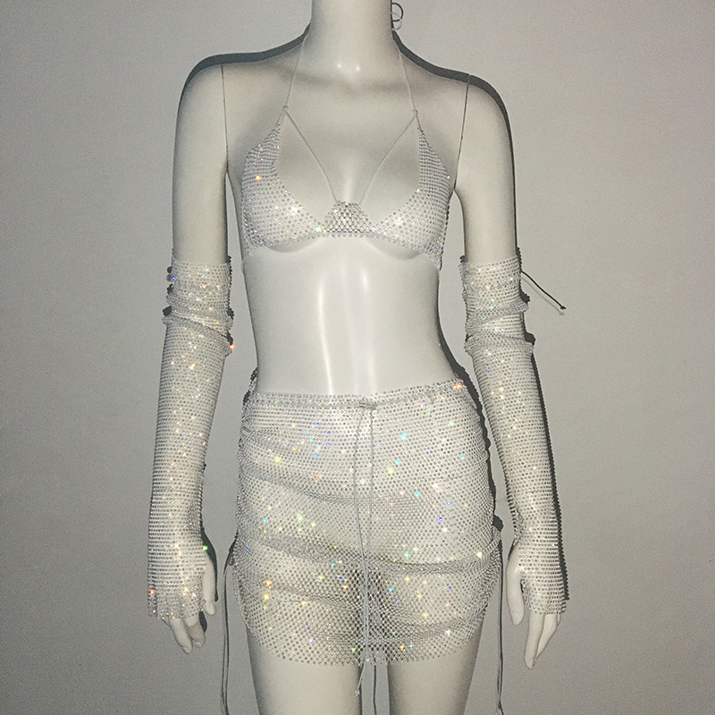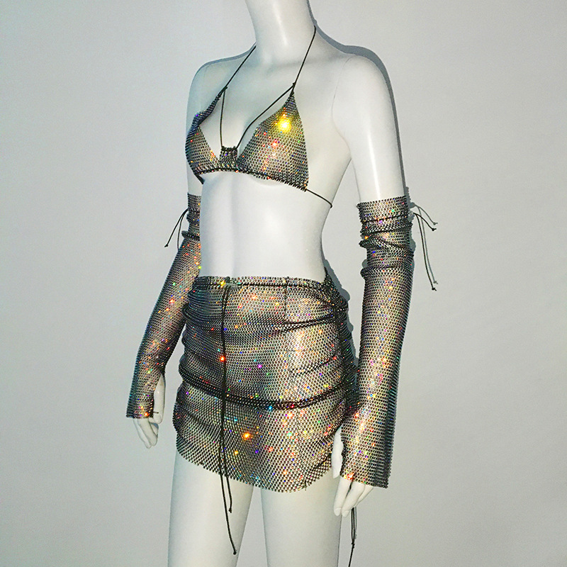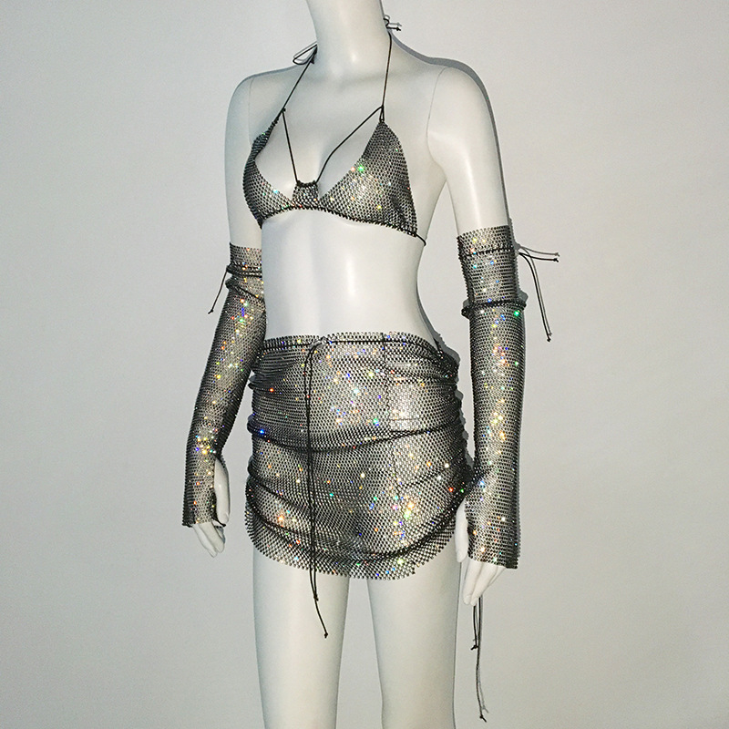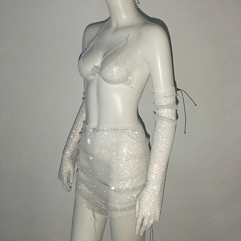 Elevate your New Year's Eve style with our 3-piece set - featuring a glitter rhinestone triangle top, arm sleeves, and a mini skirt. Perfect for making a statement on the dance floor. Shine bright and stand out in this glamorous outfit.