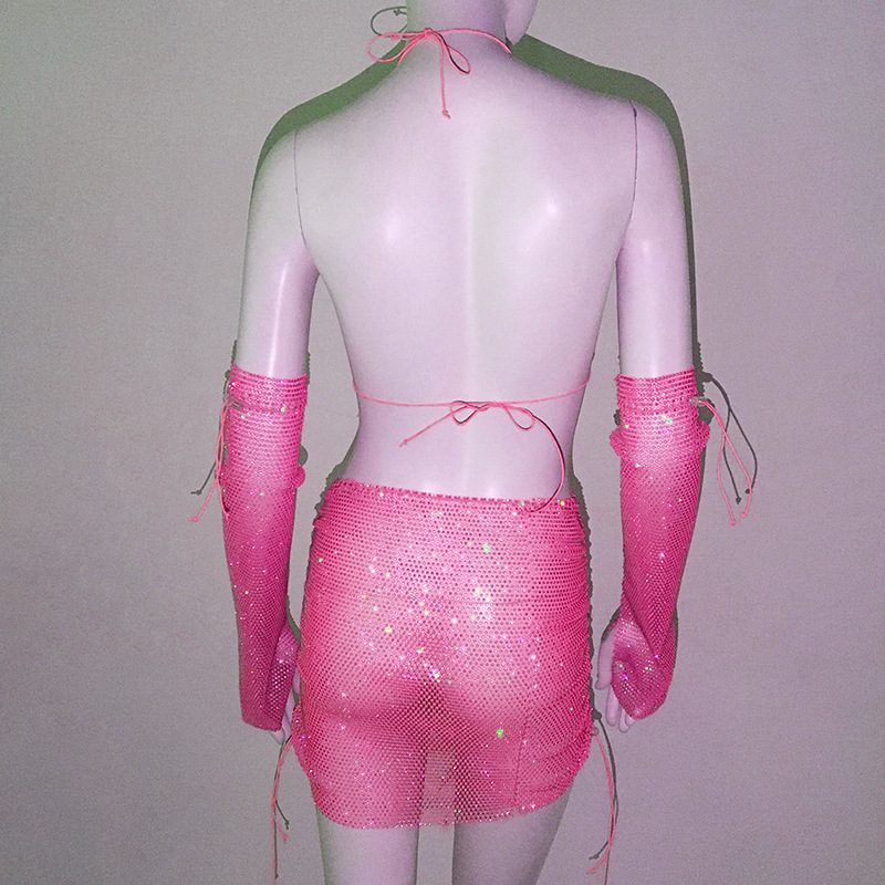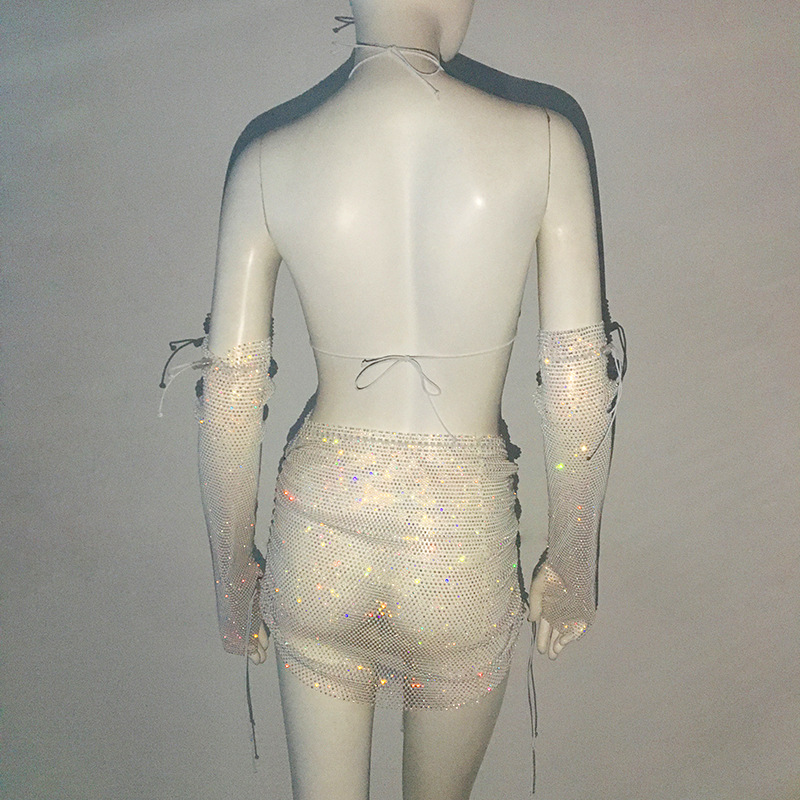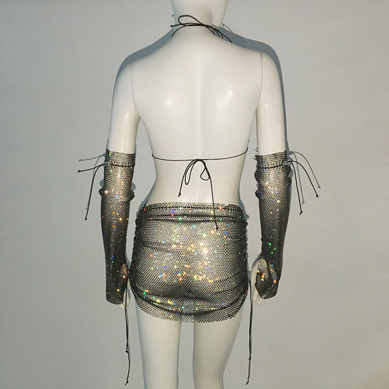 Embrace the glamour of New Year's Eve with this stunning Glitter Rhinestone Triangle Top Arm Sleeve Mini Skirt Outfit. This alluring three-piece set is designed to captivate with its slim fit and dazzling details. The halter neckline and sleeveless design exude confidence, while the backless feature adds a touch of allure.