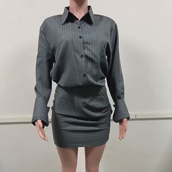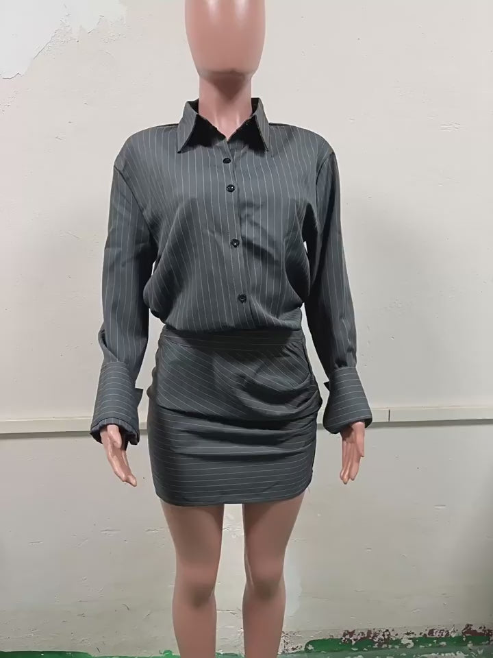 Step into effortless elegance with the Spring Stripe Skirt Set, a two-piece women's outfit perfect for warmer days. This chic set features a collared, long sleeve striped top paired with a high-rise short skirt for a flattering and put-together look. Crafted from lightweight polyester, it offers a slim fit with classic button and zipper details, ideal for spring and fall styling.