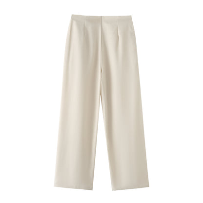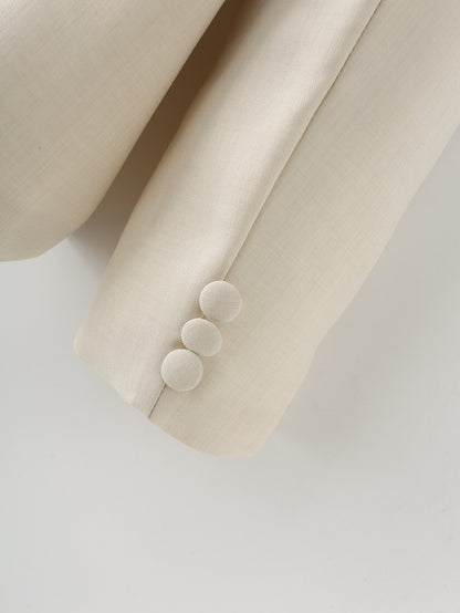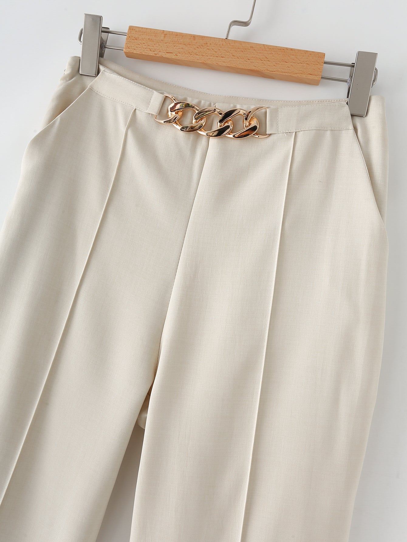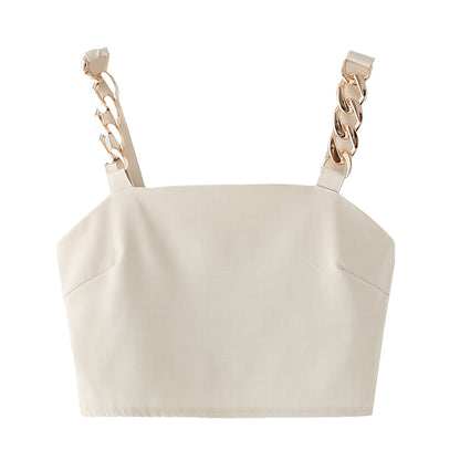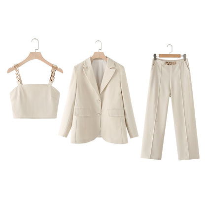 Summer 2025 | Elegant 3-Piece Work Set for Women – Metal Chain Detail Blazer, Top & High Waist Trousers