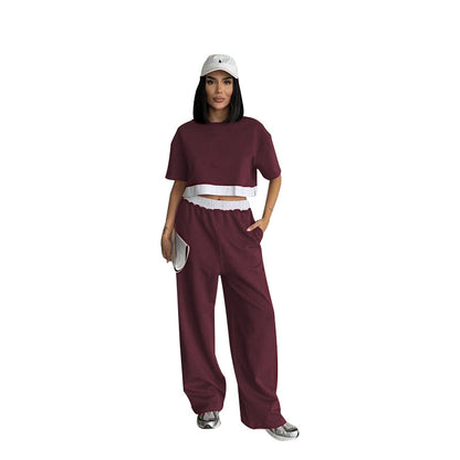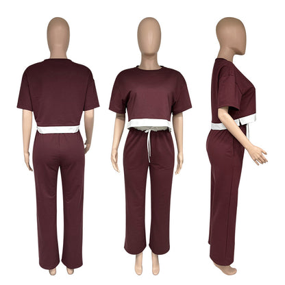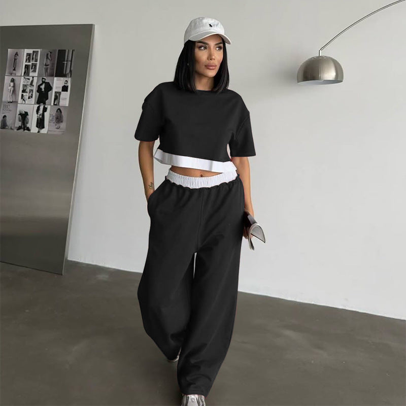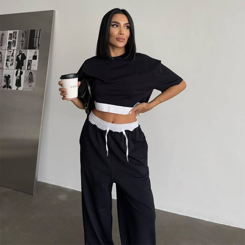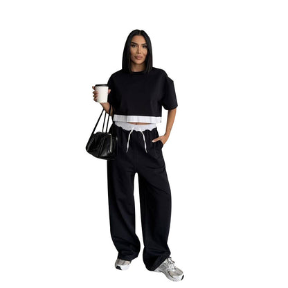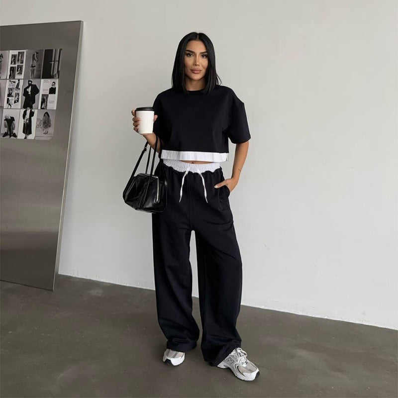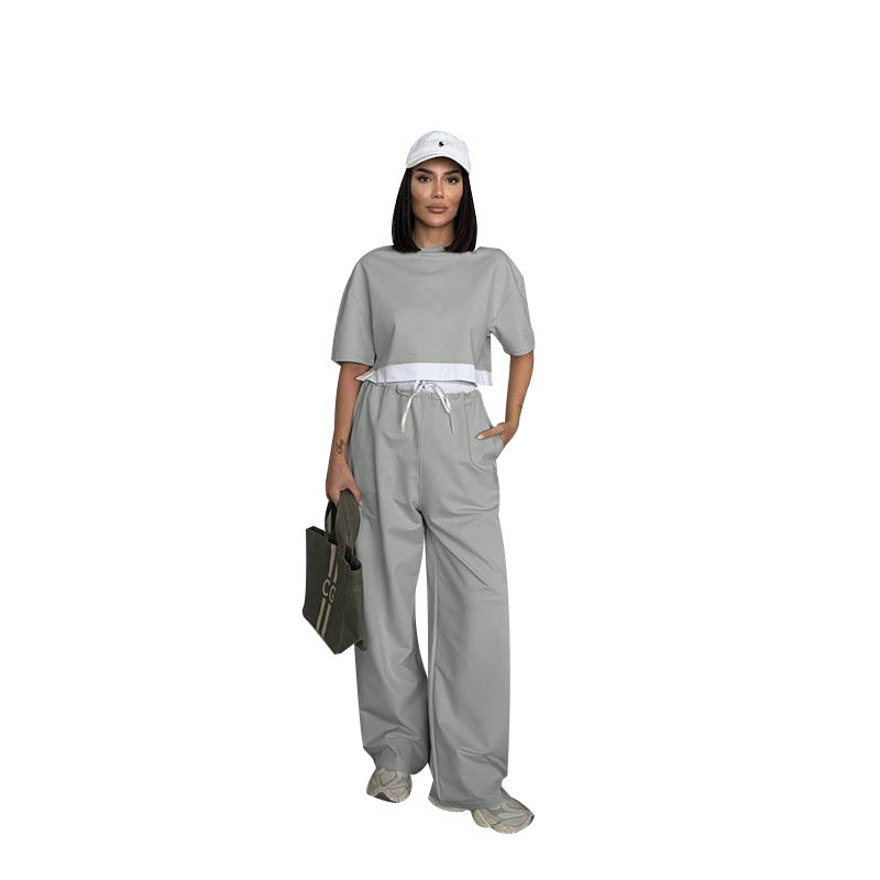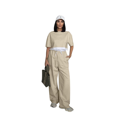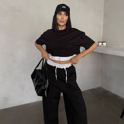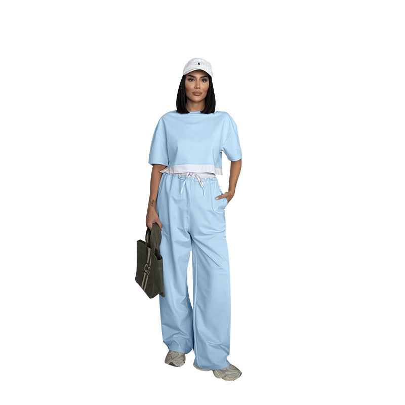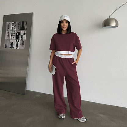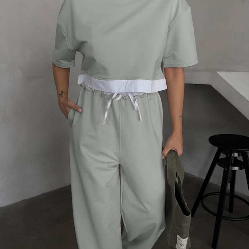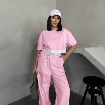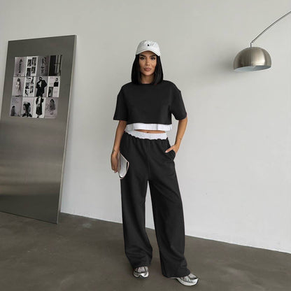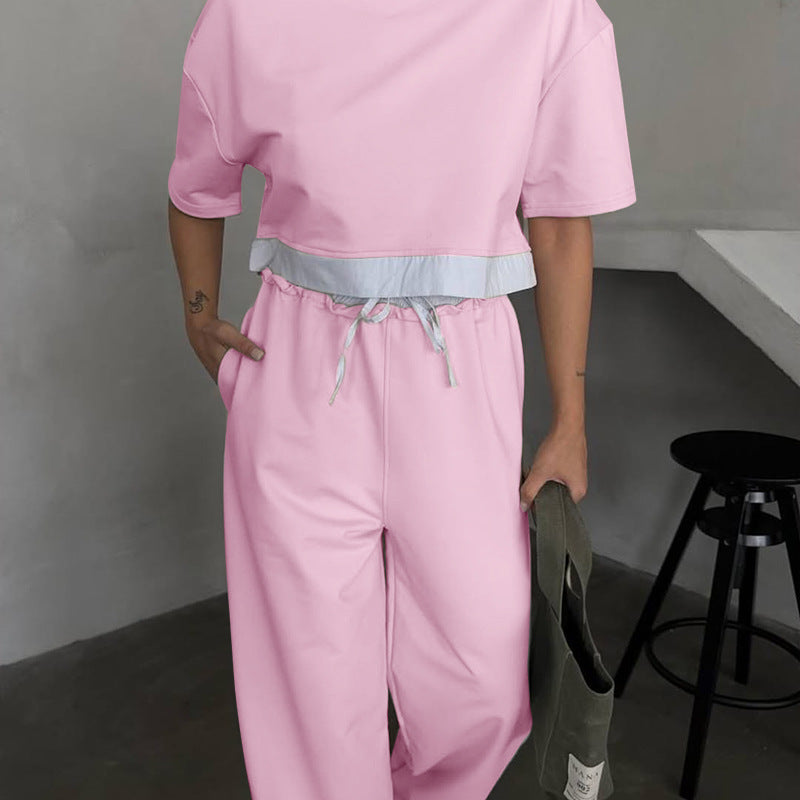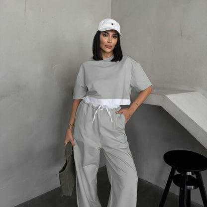 Summer 2025 | Solid Color Patchwork Cotton Sweater Top & Wide Leg Pants Set – Casual 2-Piece Lounge Fit for Women