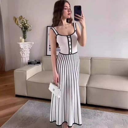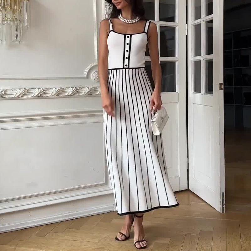 Say hello to The Camille Dress, a retro-inspired knit that blends sun-warmed stripes with soft structure and effortless charm. With delicate spaghetti straps, a striking color-contrast patchwork design, and an open back that whispers rather than shouts, this French midi is made for warm days and cooler nights.