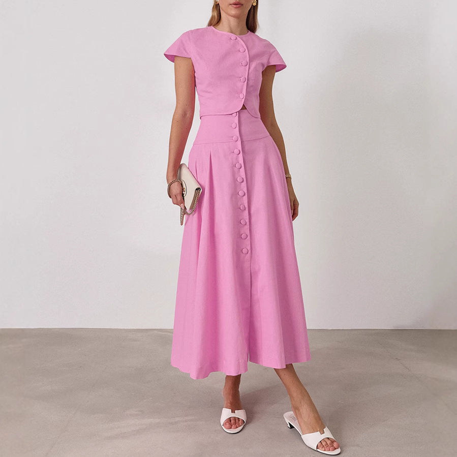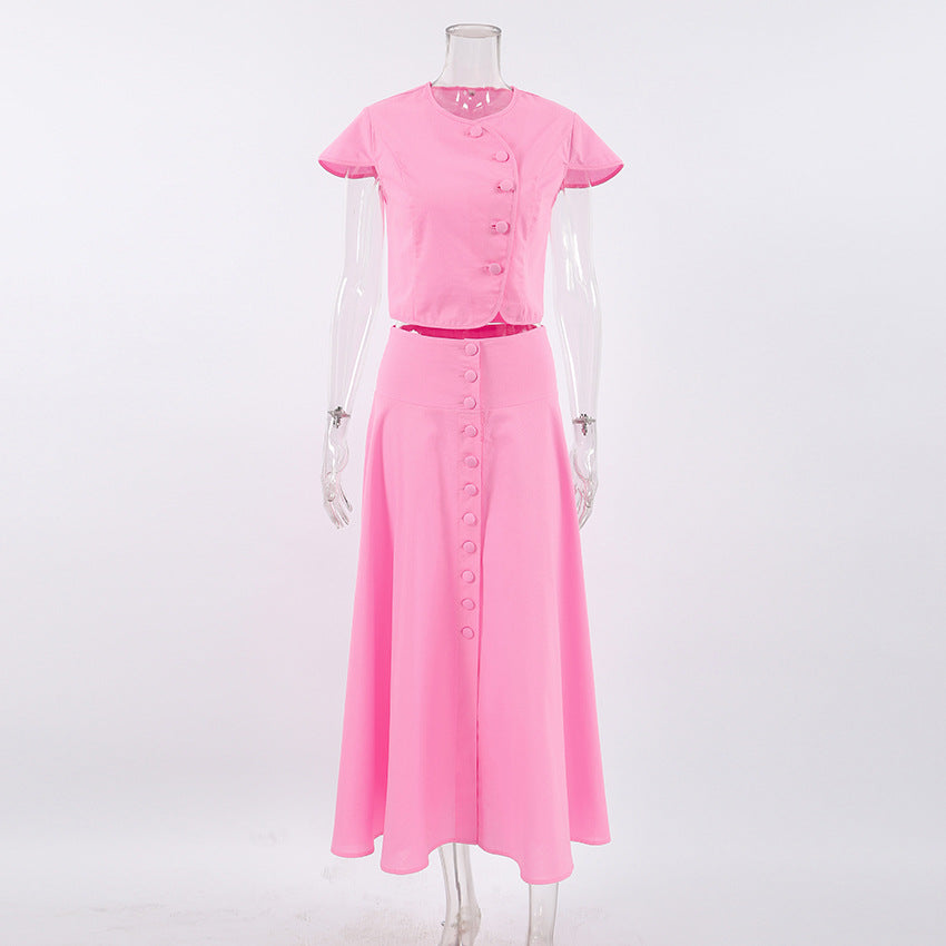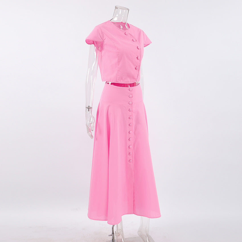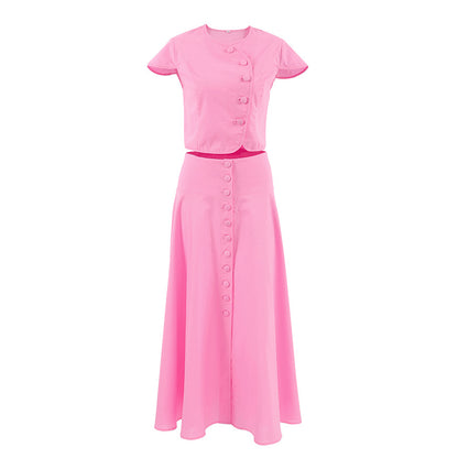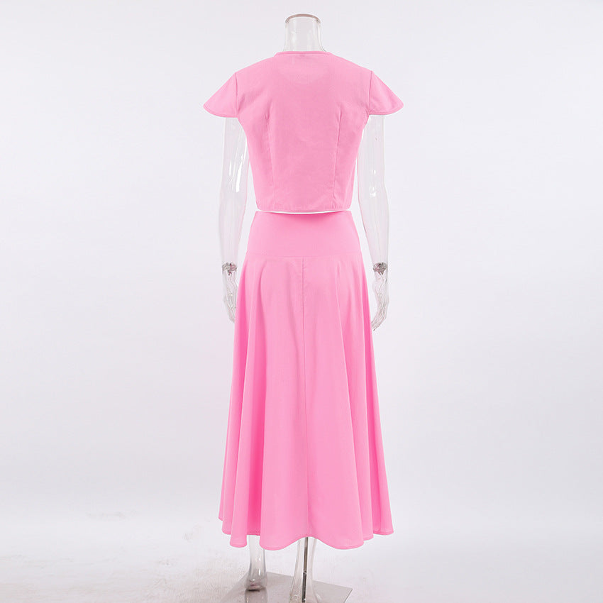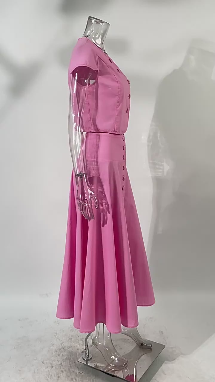 The Rosé Set – Pink Cotton V-Neck Top & High-Waist Skirt for Lighthearted Days