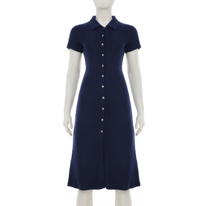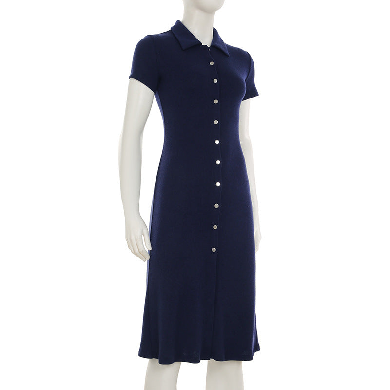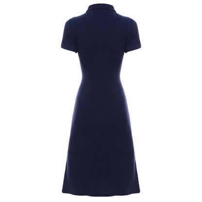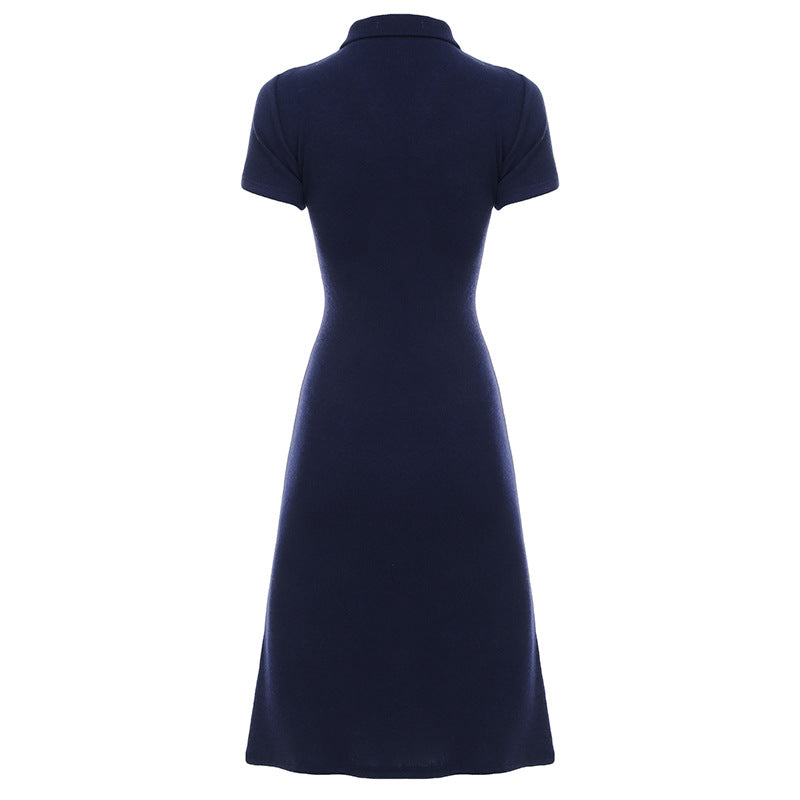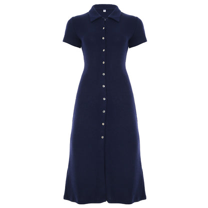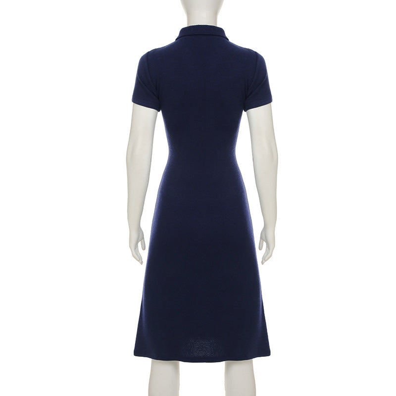 The Selene Dress – Navy Blue Knitted Polo Collar Short Sleeve Elegance