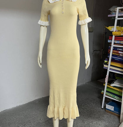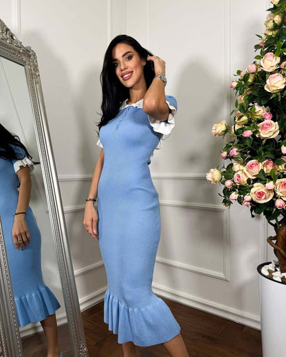 Charming and sculpted with soft intention, The Vivienne Dress brings classic femininity into focus. This slim-fitting, knitted silhouette features a subtle fishtail hem, ruffled short sleeves, and a contrasting white collar for that unmistakable Hepburn touch.