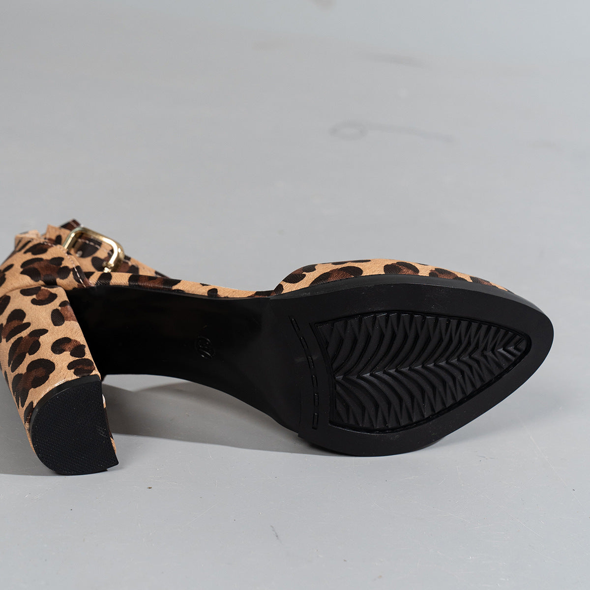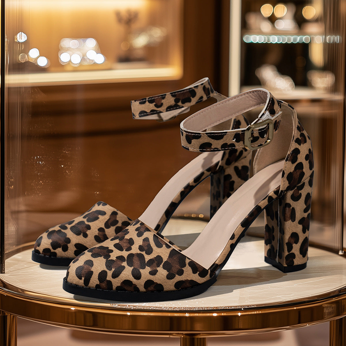 Featuring a classic pointed toe and hollowed design, these pumps create a sleek and elongated silhouette while offering a unique, stylish flair. The buckle strap detail adds a Roman-inspired touch, ensuring a secure and comfortable fit. The closed-toe design makes these heels versatile for cooler months, while the leopard print pattern injects a bold statement into any outfit.
